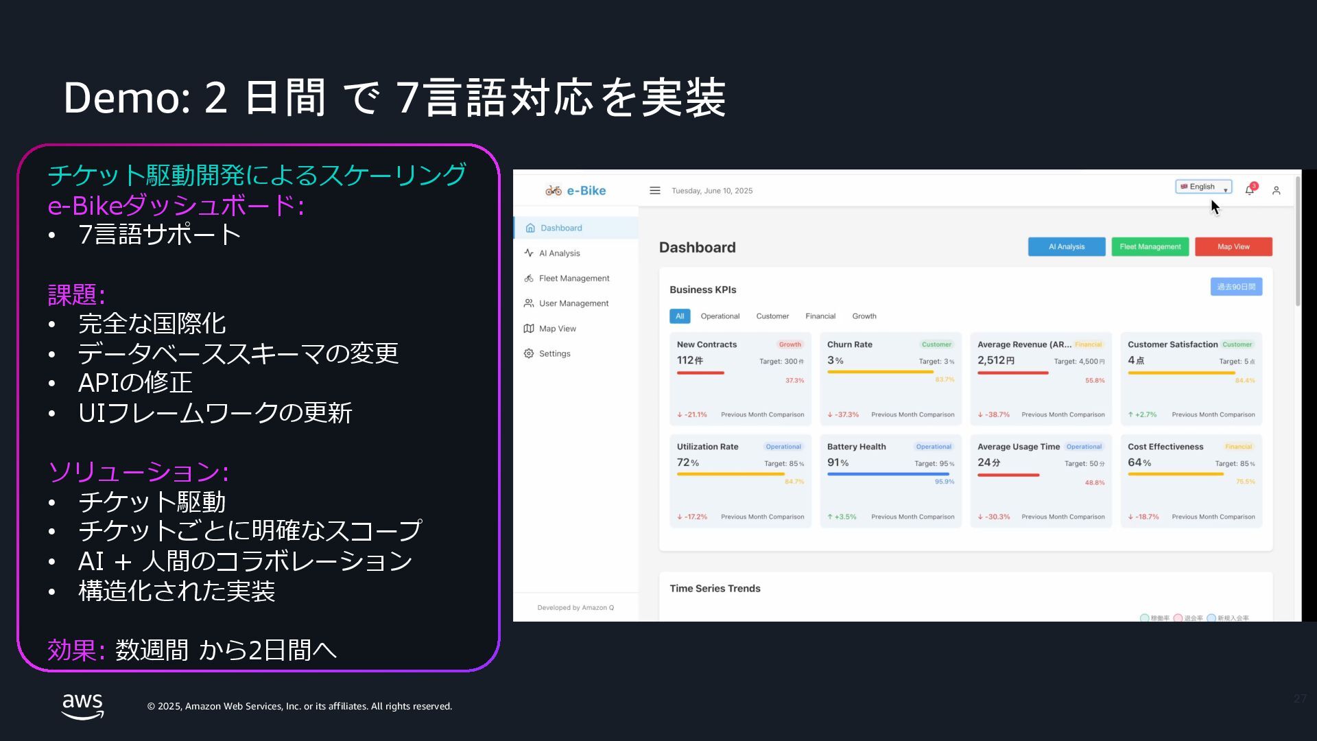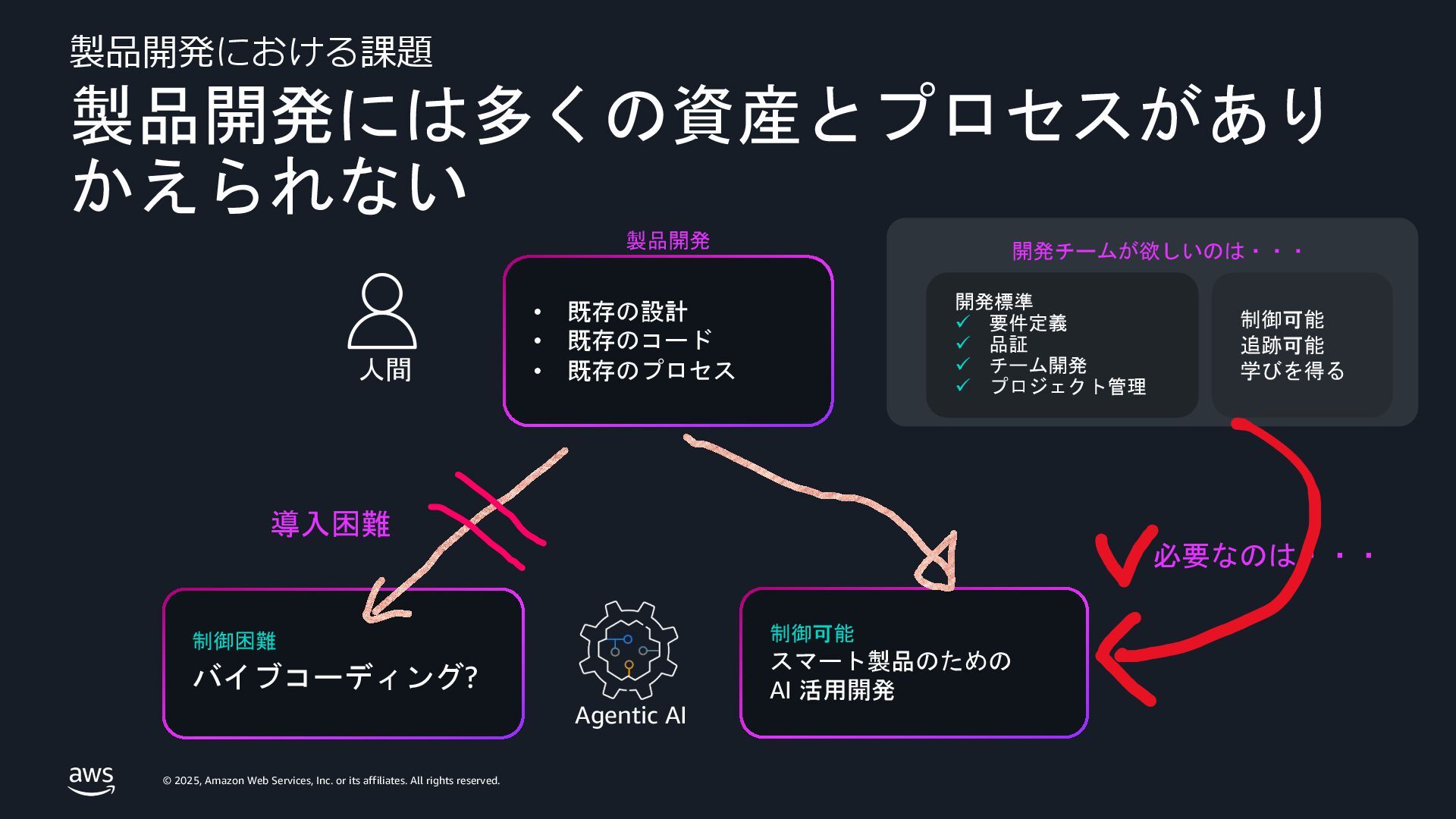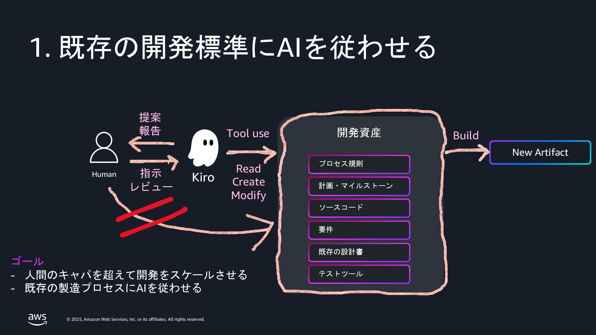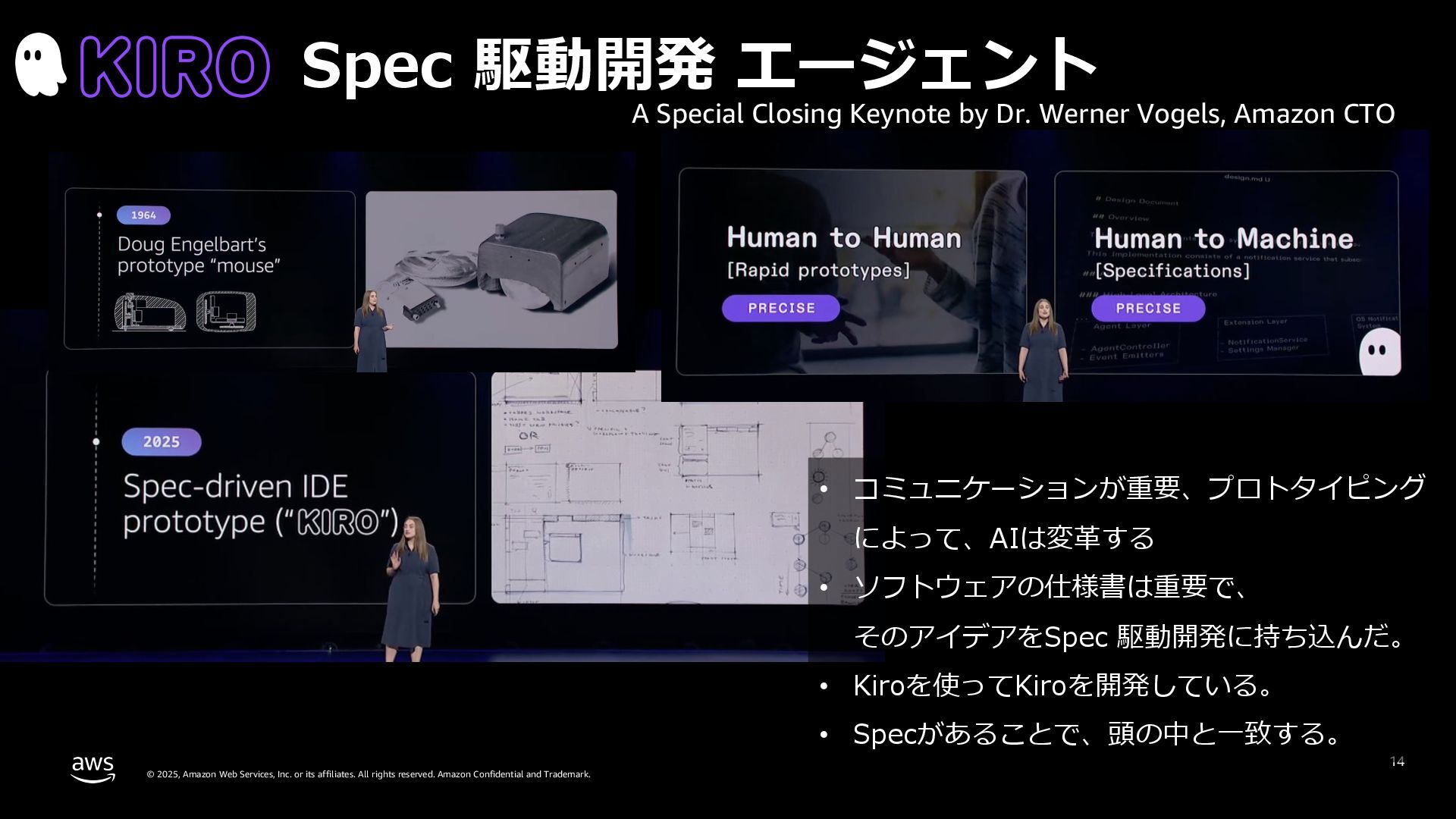 rights reserved. Amazon Confidential and Trademark. 14 Spec 駆動開発 エージェント • コミュニケーションが重要、プロトタイピング によって、AIは変⾰する • ソフトウェアの仕様書は重要で、 そのアイデアをSpec 駆動開発に持ち込んだ。 • Kiroを使ってKiroを開発している。 • Specがあることで、頭の中と⼀致する。 A Special Closing Keynote by Dr. Werner Vogels, Amazon CTO