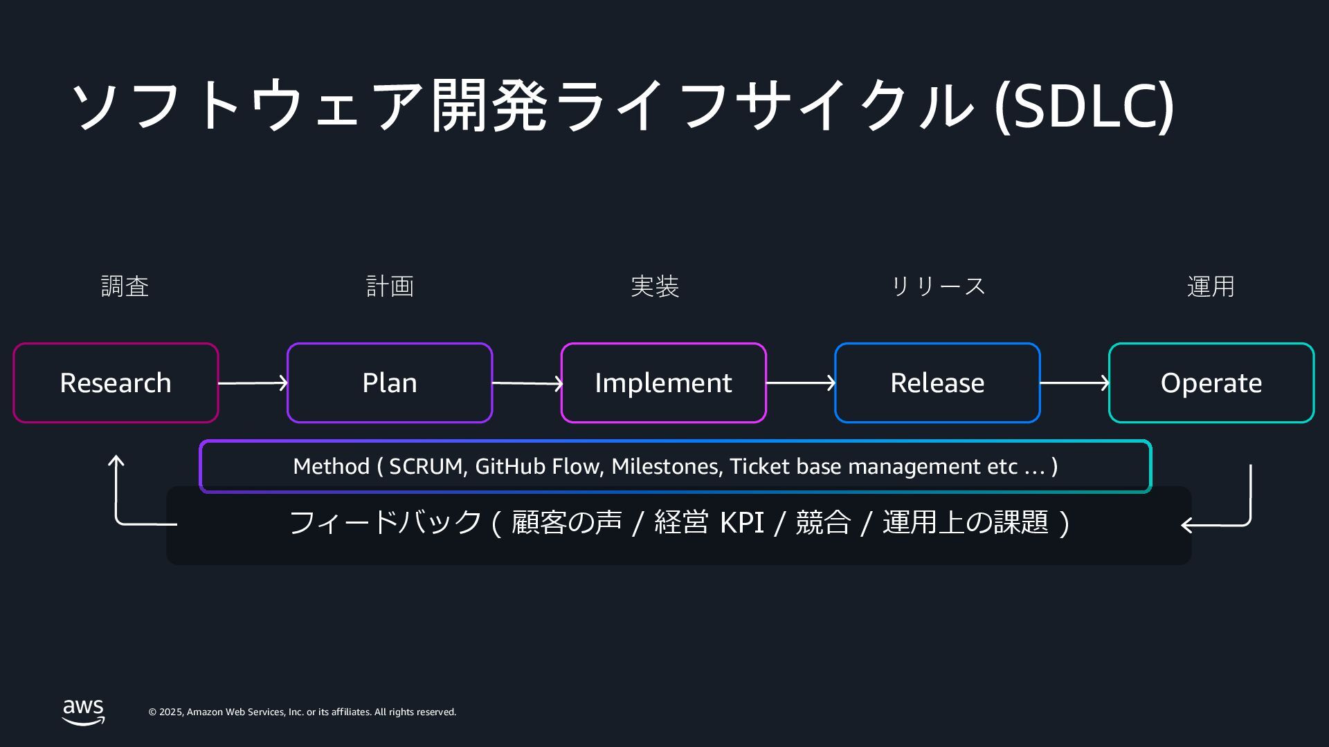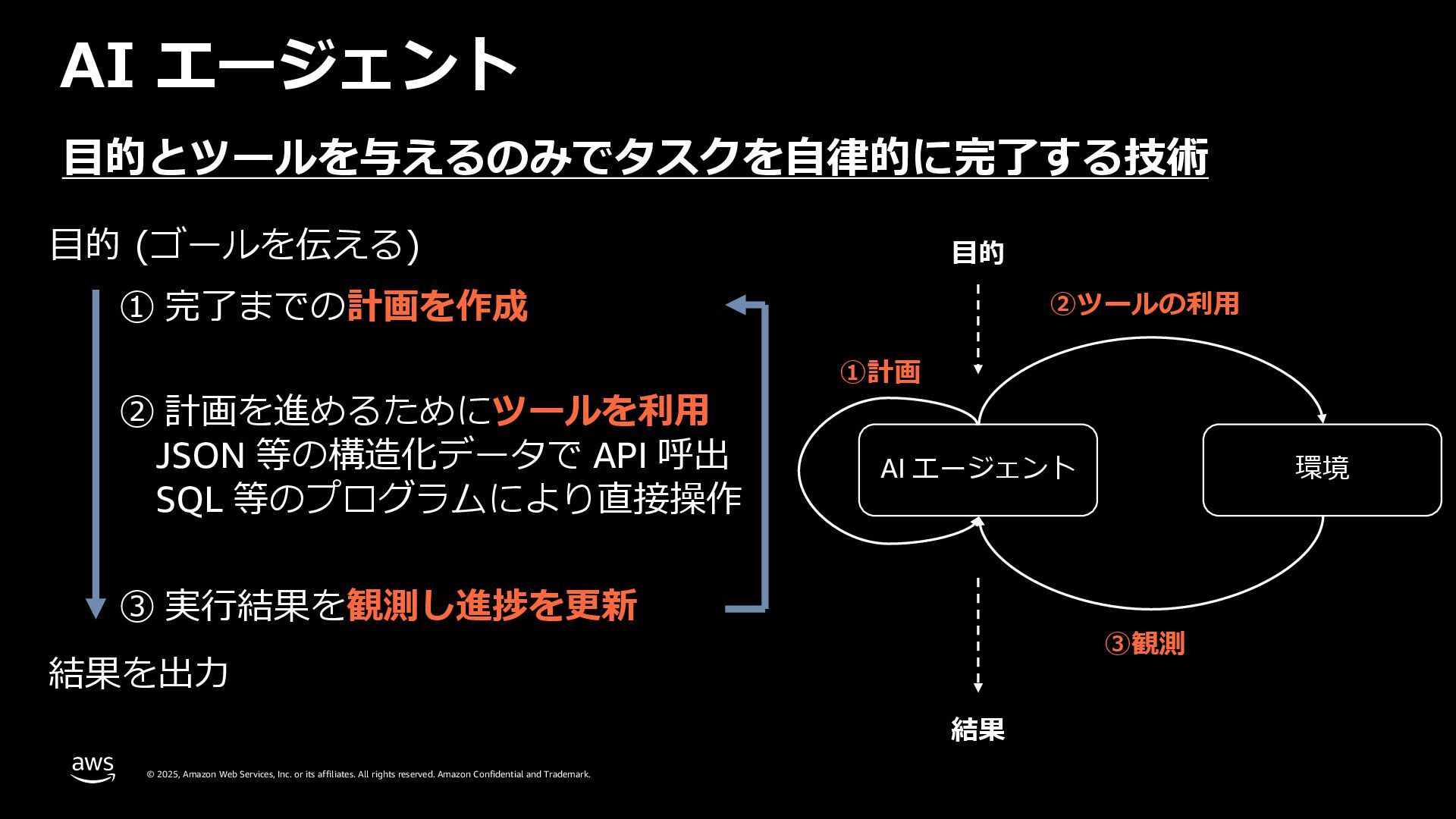 rights reserved. Amazon Confidential and Trademark. AI エージェント ⽬的 (ゴールを伝える) AI エージェント 環境 ②ツールの利⽤ ③観測 ⽬的 結果 ①計画 ⽬的とツールを与えるのみでタスクを⾃律的に完了する技術 ① 完了までの計画を作成 ② 計画を進めるためにツールを利⽤ JSON 等の構造化データで API 呼出 SQL 等のプログラムにより直接操作 ③ 実⾏結果を観測し進捗を更新 結果を出⼒