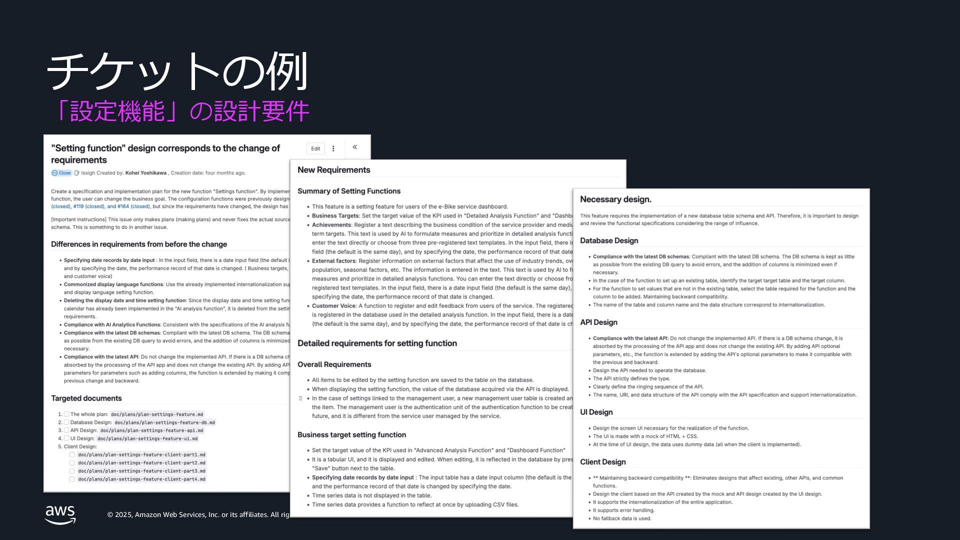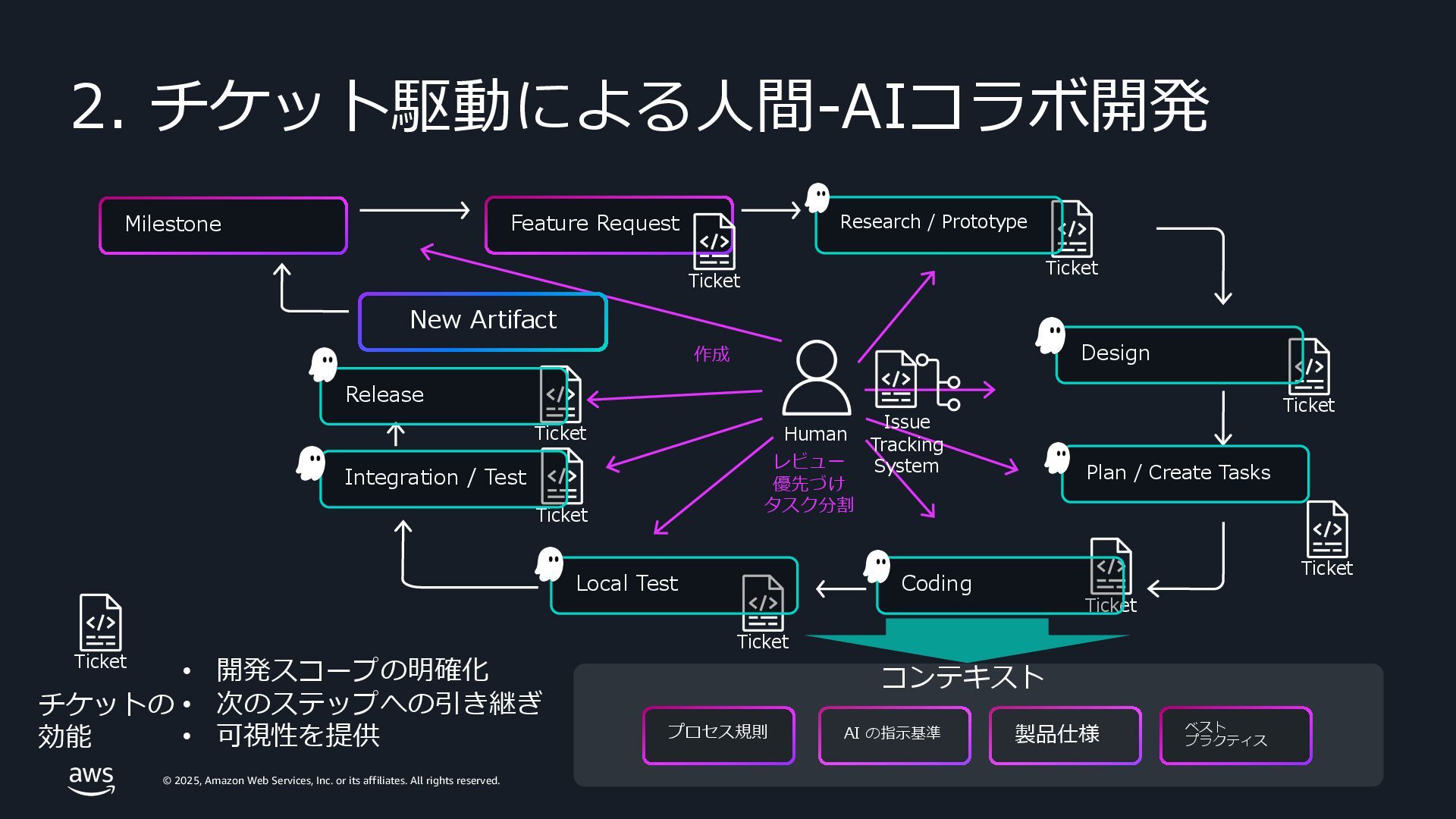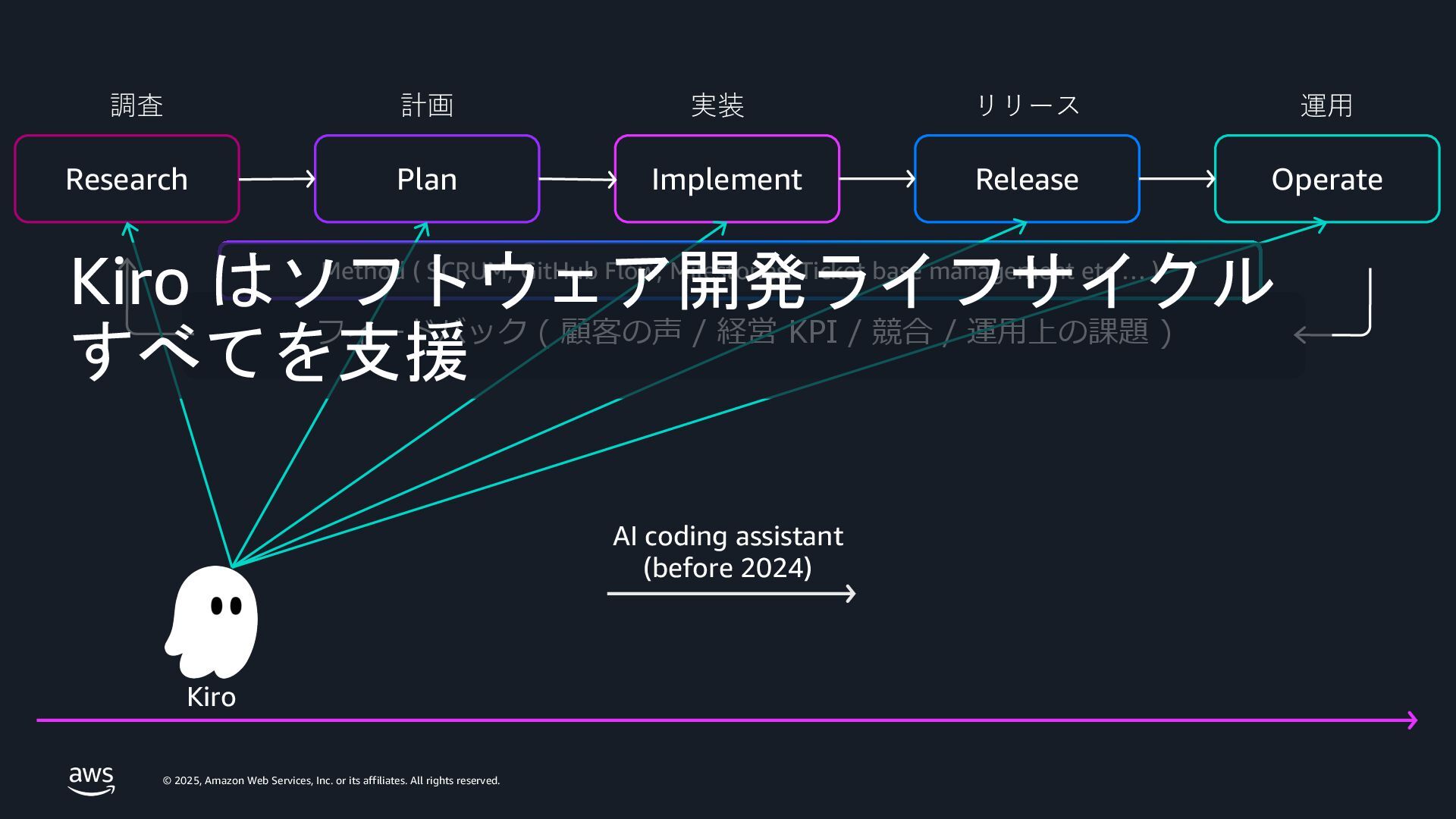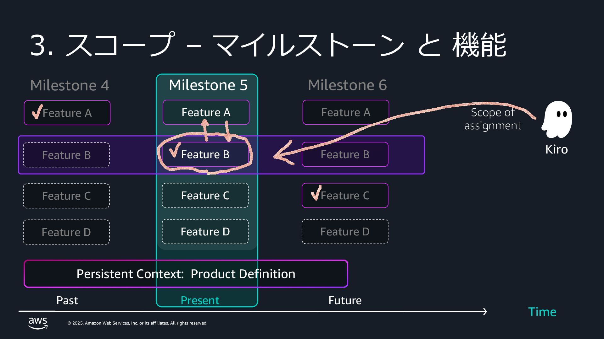 rights reserved. 3. スコープ – マイルストーン と 機能 Time Milestone 4 Milestone 5 Milestone 6 Persistent Context: Product Definition Present Past Future Feature B Feature B Feature B Feature A Feature A Feature A Feature C Feature C Feature C Feature D Feature D Feature D Scope of assignment Kiro