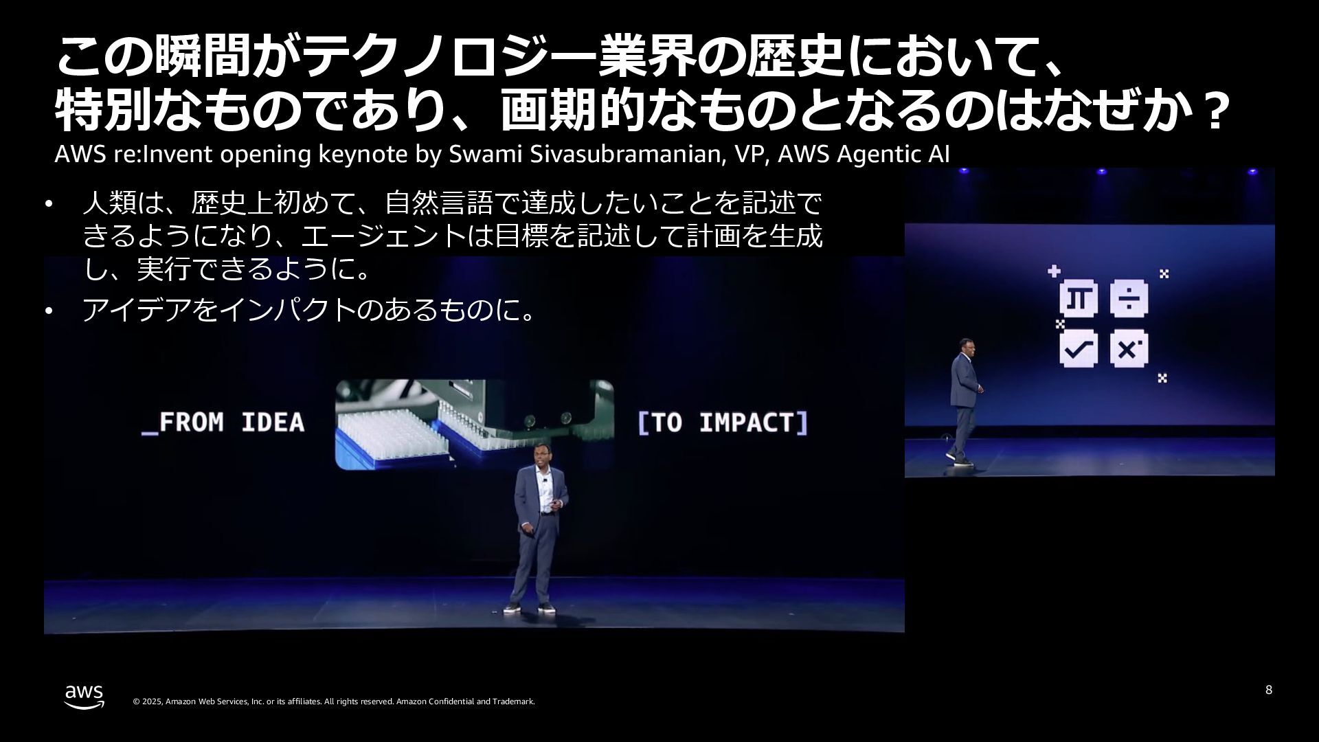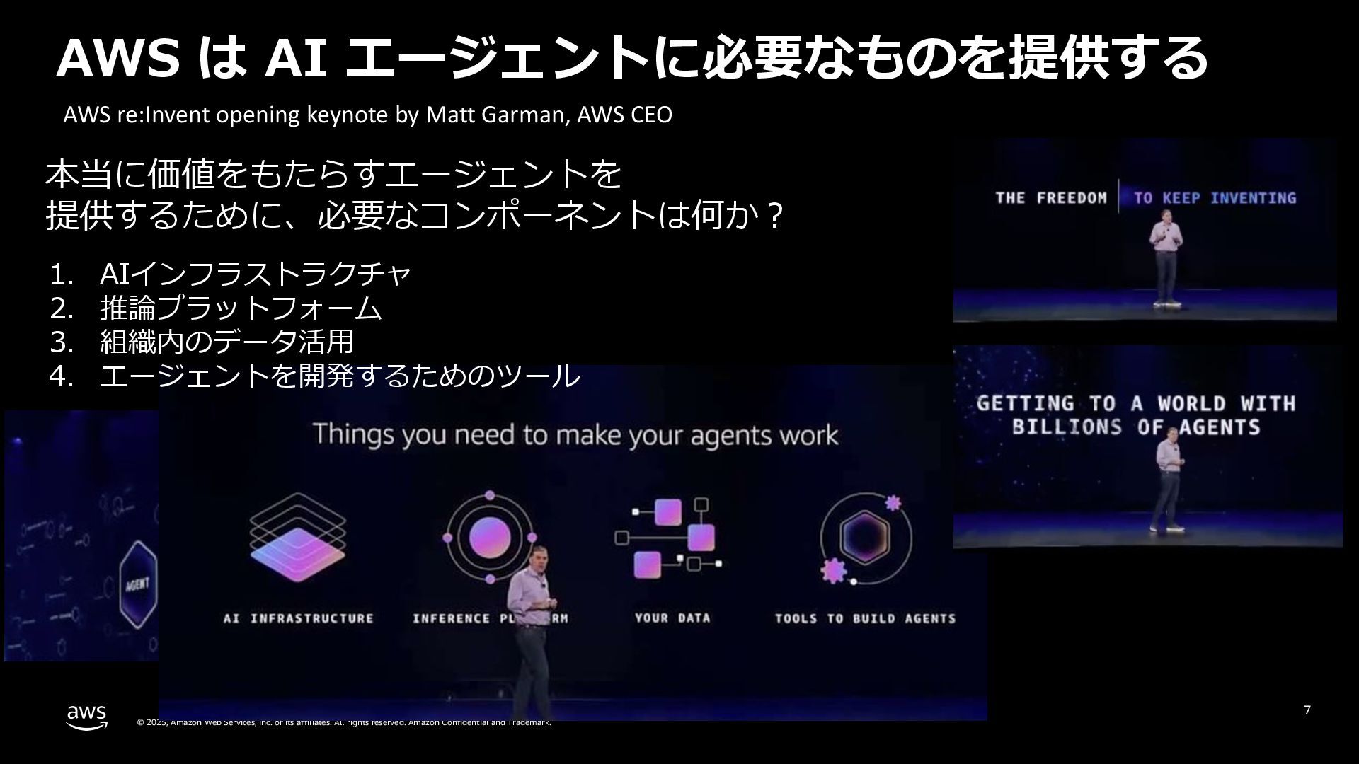 rights reserved. Amazon Confidential and Trademark. 7 AWS は AI エージェントに必要なものを提供する 本当に価値をもたらすエージェントを 提供するために、必要なコンポーネントは何か︖ 1. AIインフラストラクチャ 2. 推論プラットフォーム 3. 組織内のデータ活⽤ 4. エージェントを開発するためのツール AWS re:Invent opening keynote by Matt Garman, AWS CEO