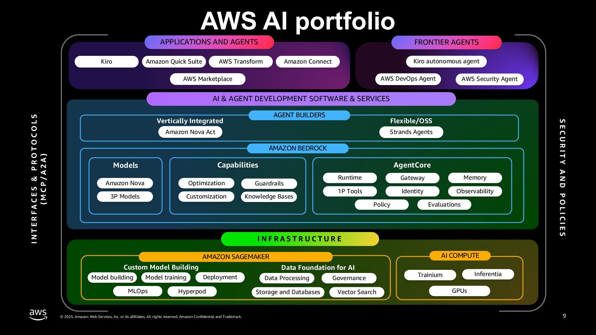 rights reserved. Amazon Confidential and Trademark. AWS AI portfolio AI & AGENT DEVELOPMENT SOFTWARE & SERVICES AGENT BUILDERS Vertically Integrated Flexible/OSS AMAZON BEDROCK Models Capabilities AgentCore Amazon Nova 3P Models Optimization Guardrails Customization Runtime 1P Tools Gateway Identity Memory Observability Kiro Amazon Quick Suite AWS Transform Amazon Connect Kiro autonomous agent I N T E R F A C E S & P R O T O C O L S ( M C P / A 2 A ) Amazon Nova Act Strands Agents AI COMPUTE Trainium MLOps Model training Deployment Model building Inferentia GPUs Vector Search Governance Storage and Databases Data Processing Hyperpod AMAZON SAGEMAKER Custom Model Building Data Foundation for AI APPLICATIONS AND AGENTS AWS Security Agent AWS DevOps Agent AWS Marketplace FRONTIER AGENTS Knowledge Bases Policy Evaluations S E C U R I T Y A N D P O L I C I E S 10 I N F R A S T R U C T U R E