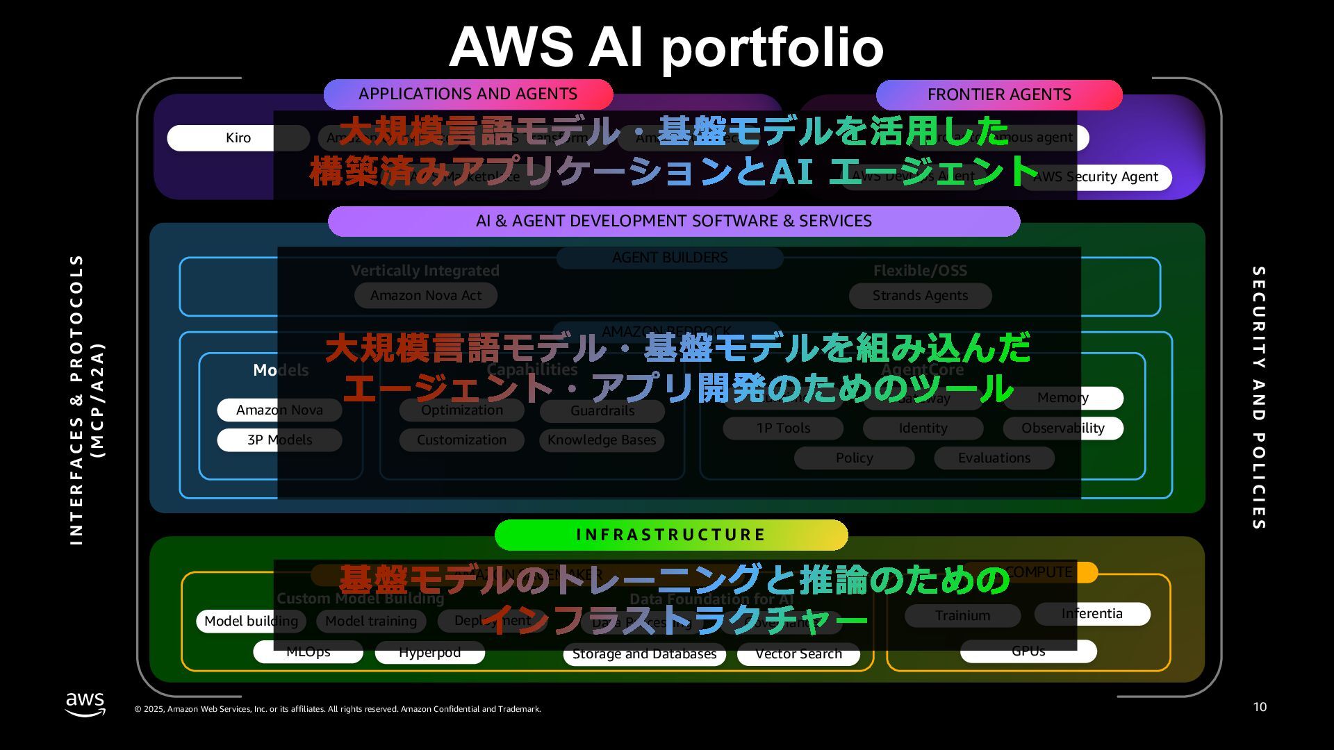 rights reserved. Amazon Confidential and Trademark. AWS AI portfolio AI & AGENT DEVELOPMENT SOFTWARE & SERVICES AGENT BUILDERS Vertically Integrated Flexible/OSS AMAZON BEDROCK Models Capabilities AgentCore Amazon Nova 3P Models Optimization Guardrails Customization Runtime 1P Tools Gateway Identity Memory Observability Kiro Amazon Quick Suite AWS Transform Amazon Connect Kiro autonomous agent I N T E R F A C E S & P R O T O C O L S ( M C P / A 2 A ) Amazon Nova Act Strands Agents AI COMPUTE Trainium MLOps Model training Deployment Model building Inferentia GPUs Vector Search Governance Storage and Databases Data Processing Hyperpod AMAZON SAGEMAKER Custom Model Building Data Foundation for AI APPLICATIONS AND AGENTS AWS Security Agent AWS DevOps Agent AWS Marketplace FRONTIER AGENTS Knowledge Bases Policy Evaluations S E C U R I T Y A N D P O L I C I E S 9 I N F R A S T R U C T U R E