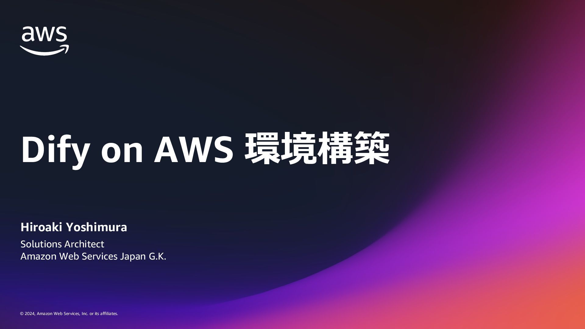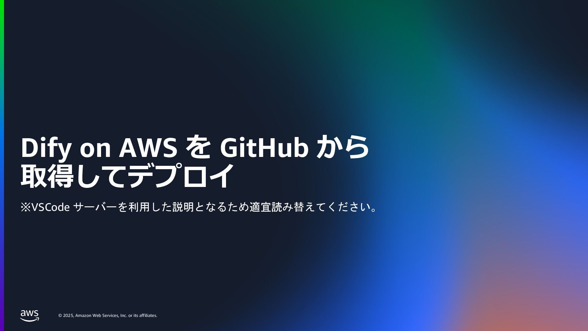 aws-samples/dify-self-hosted-on-aws で提供されている、Dify on AWS のサンプル実装をセルフホストするための、ステップバイステップの手順書です。