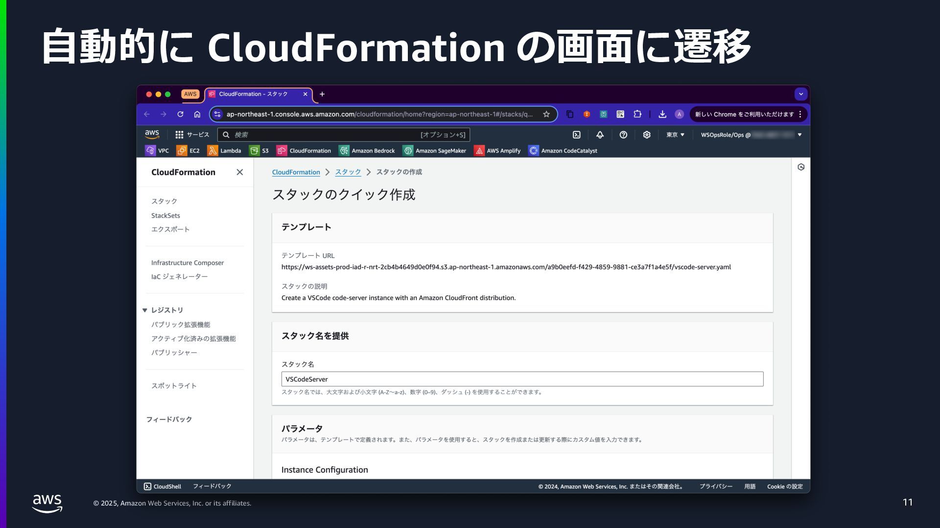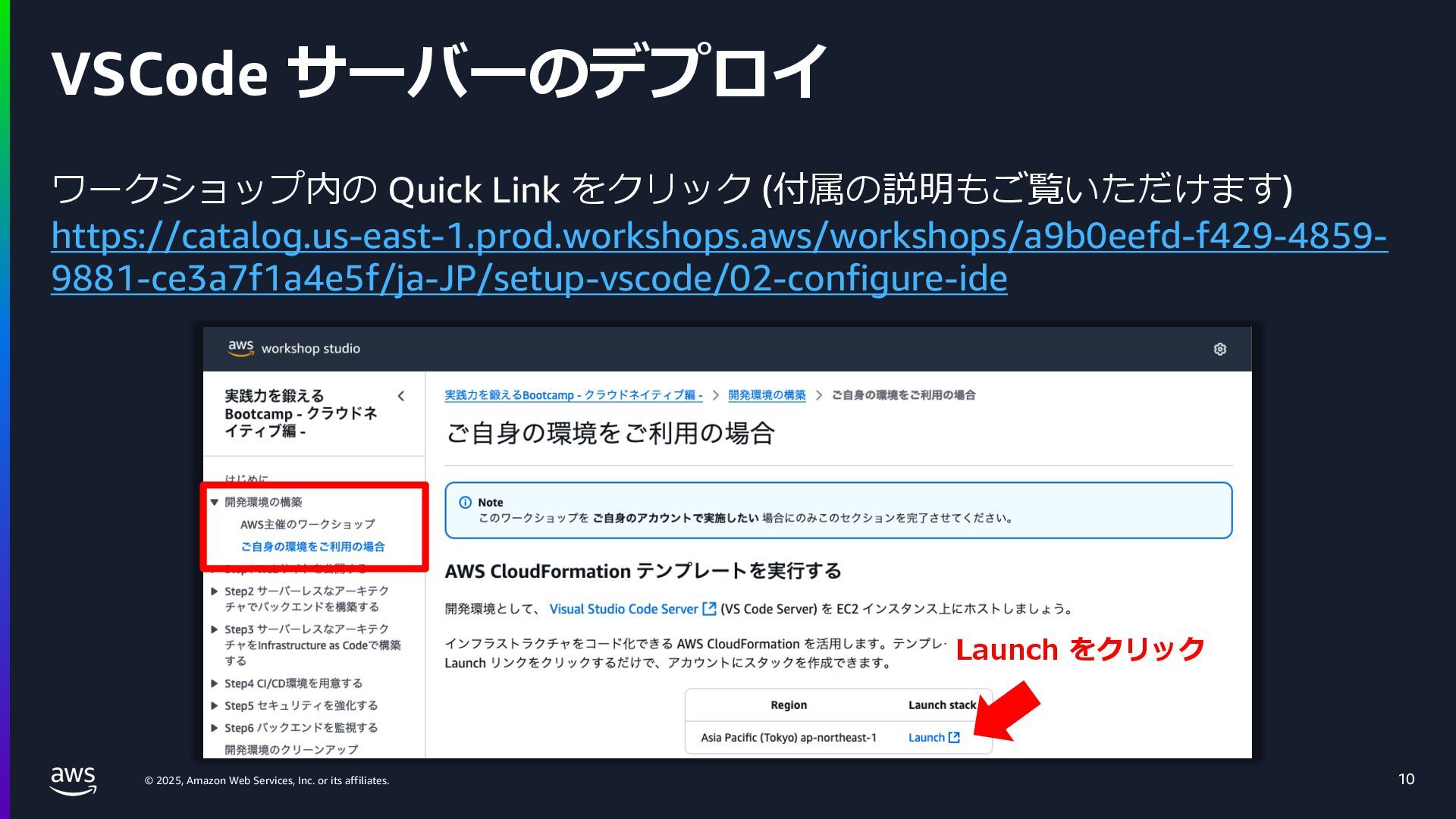 サーバーのデプロイ 10 ワークショップ内の Quick Link をクリック (付属の説明もご覧いただけます) https://catalog.us-east-1.prod.workshops.aws/workshops/a9b0eefd-f429-4859- 9881-ce3a7f1a4e5f/ja-JP/setup-vscode/02-configure-ide Launch をクリック