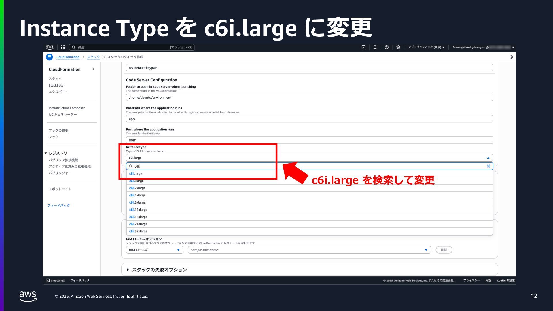 Type を c6i.large に変更 12 c6i.large を検索して変更