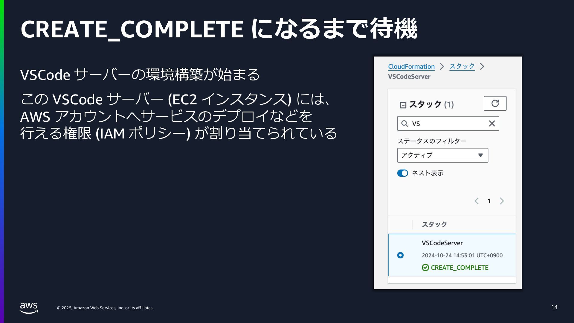 になるまで待機 VSCode サーバーの環境構築が始まる この VSCode サーバー (EC2 インスタンス) には、 AWS アカウントへサービスのデプロイなどを ⾏える権限 (IAM ポリシー) が割り当てられている 14
