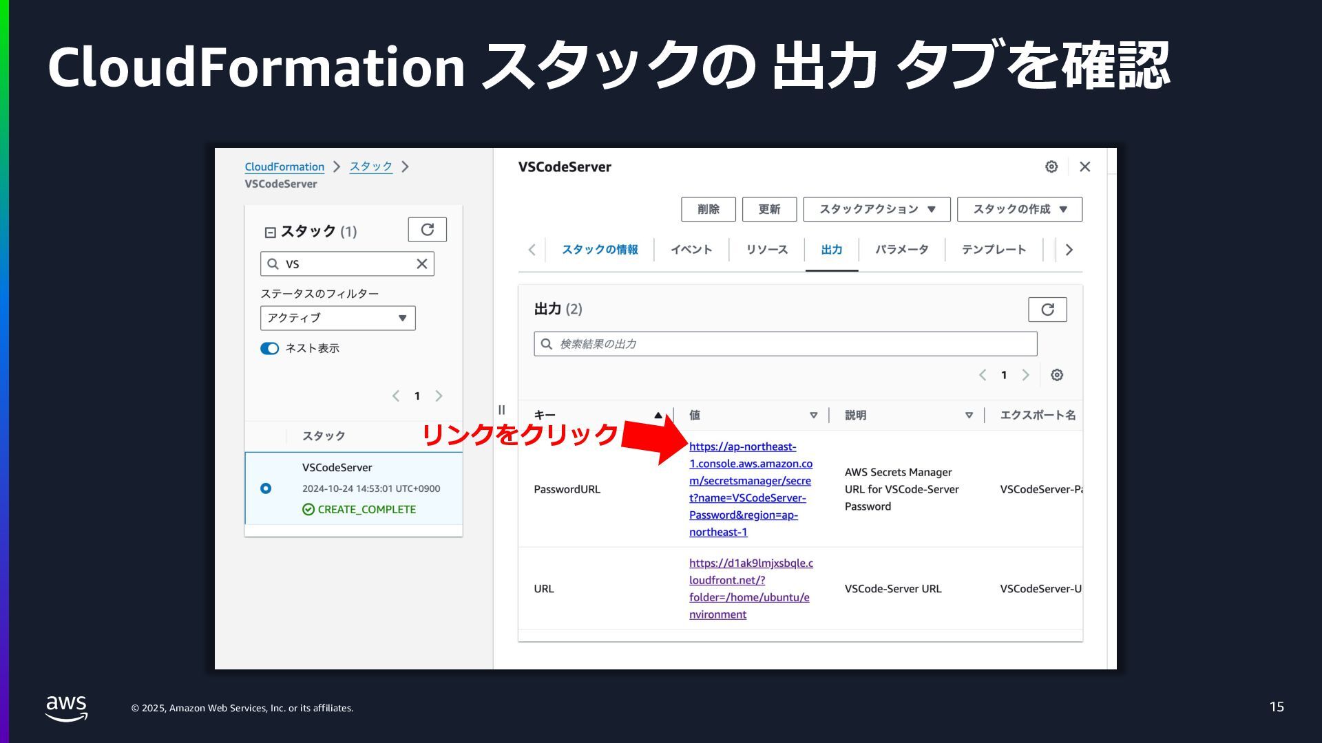 スタックの 出⼒ タブを確認 15 リンクをクリック