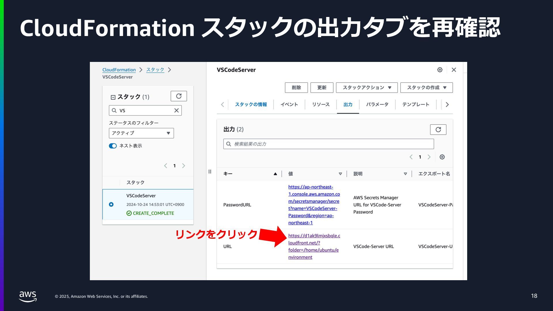 スタックの出⼒タブを再確認 18 リンクをクリック