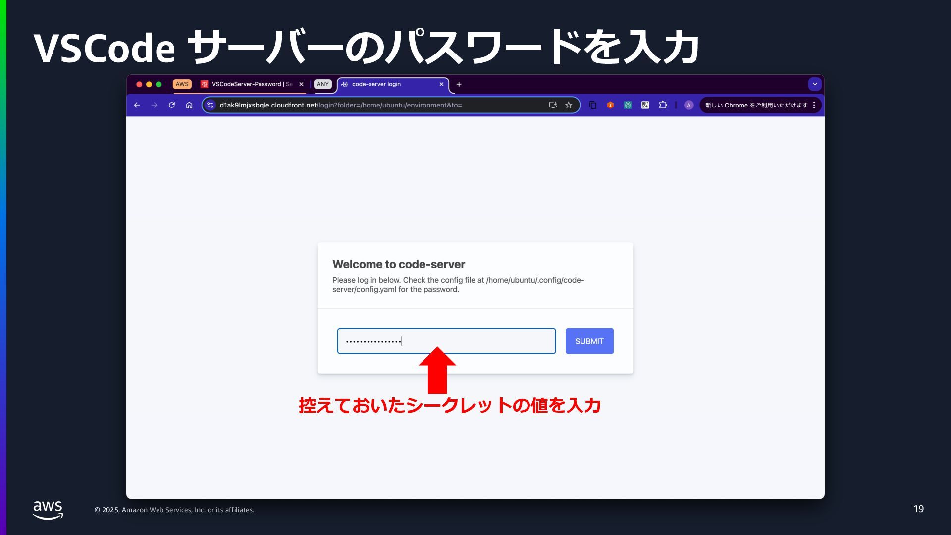 サーバーのパスワードを⼊⼒ 19 控えておいたシークレットの値を⼊⼒