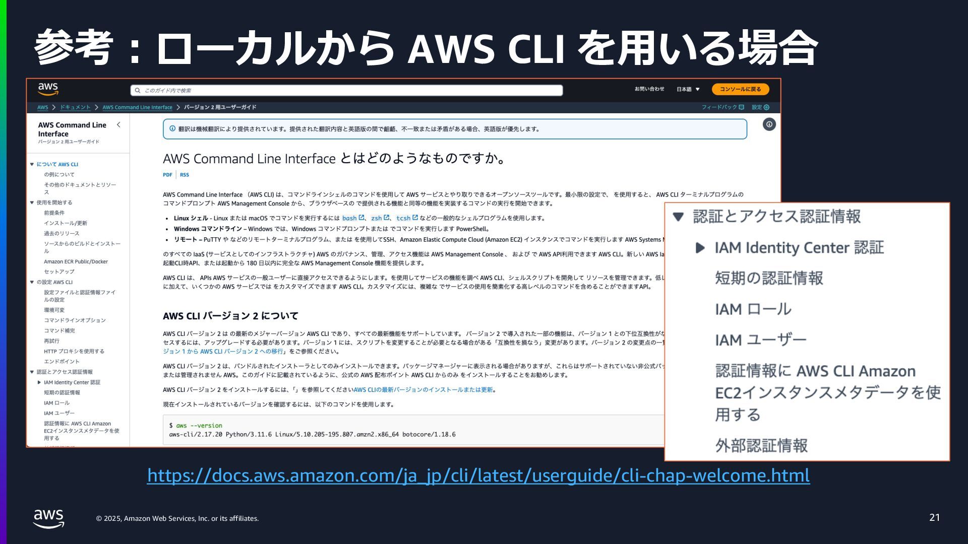 AWS CLI を⽤いる場合 21 https://docs.aws.amazon.com/ja_jp/cli/latest/userguide/cli-chap-welcome.html