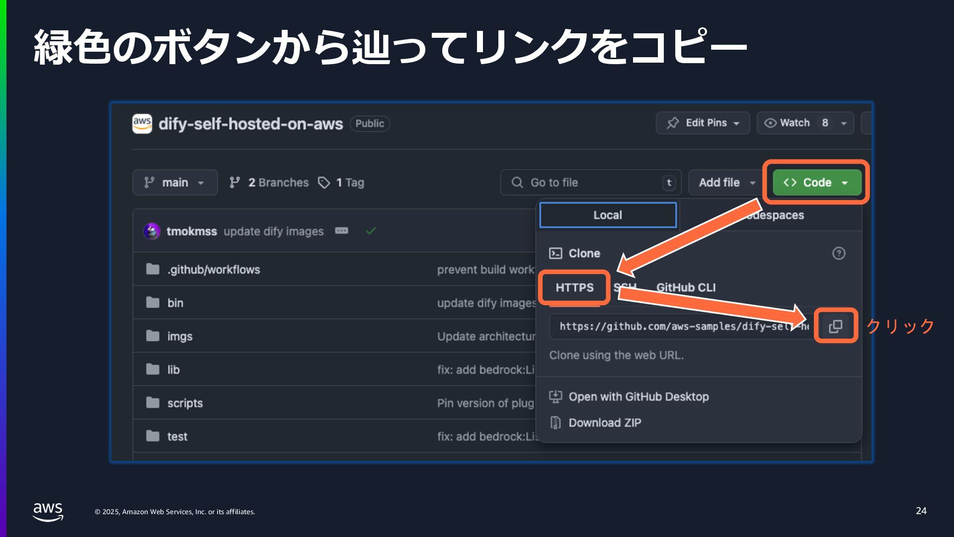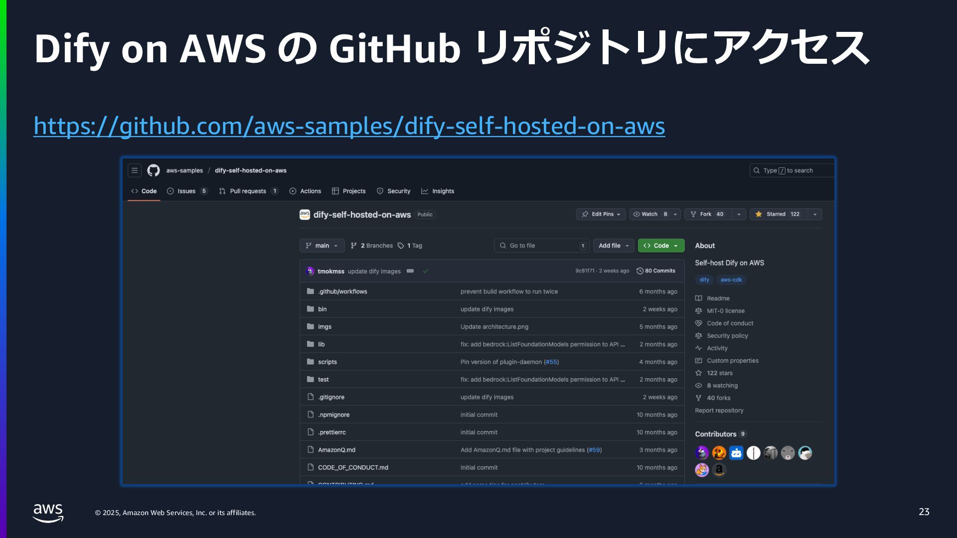 on AWS の GitHub リポジトリにアクセス https://github.com/aws-samples/dify-self-hosted-on-aws 23