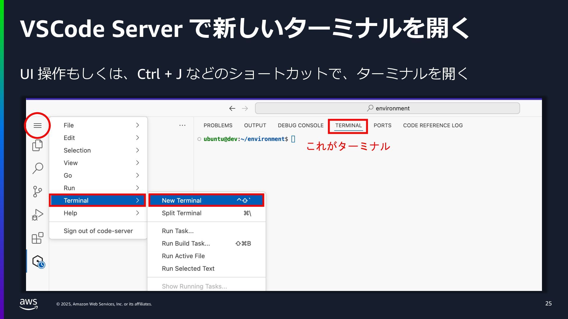 Server で新しいターミナルを開く UI 操作もしくは、Ctrl + J などのショートカットで、ターミナルを開く 25 これがターミナル
