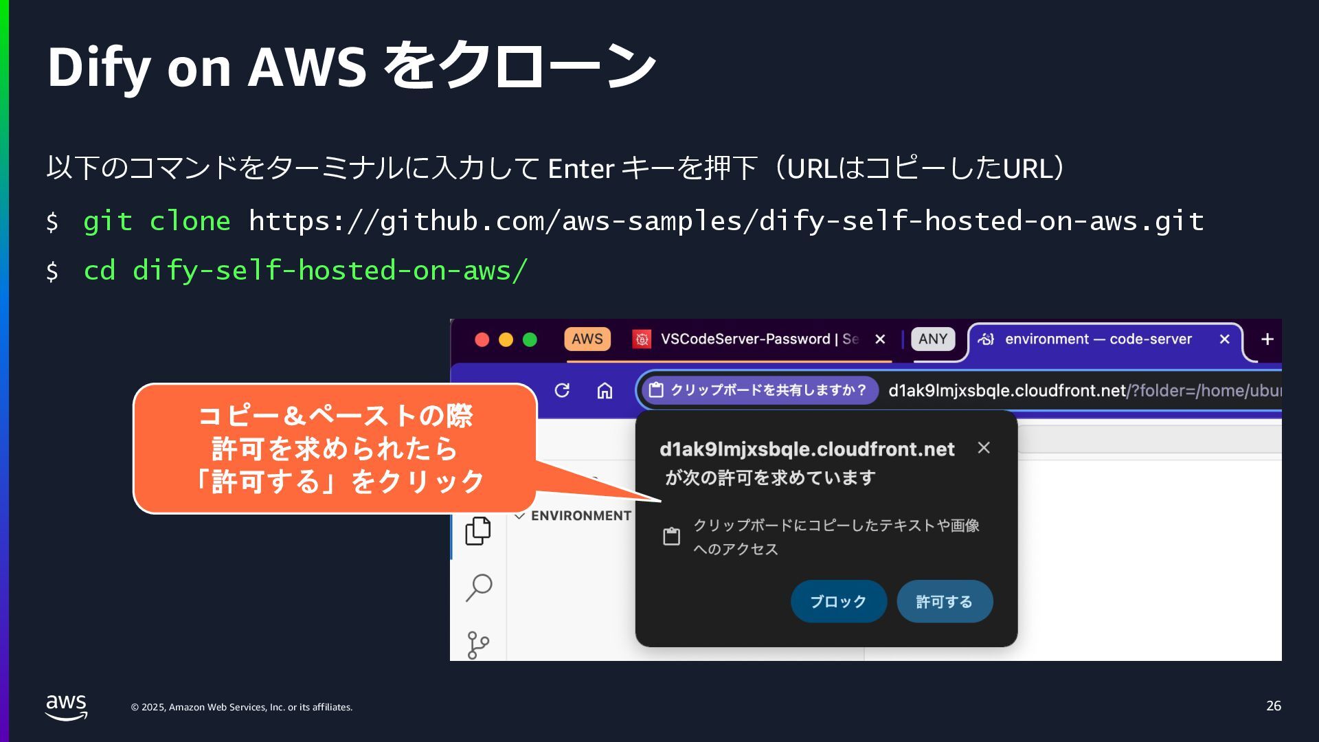 on AWS をクローン 以下のコマンドをターミナルに⼊⼒して Enter キーを押下(URLはコピーしたURL) $ git clone https://github.com/aws-samples/dify-self-hosted-on-aws.git $ cd dify-self-hosted-on-aws/ 26 コピー&ペーストの際 許可を求められたら 「許可する」をクリック