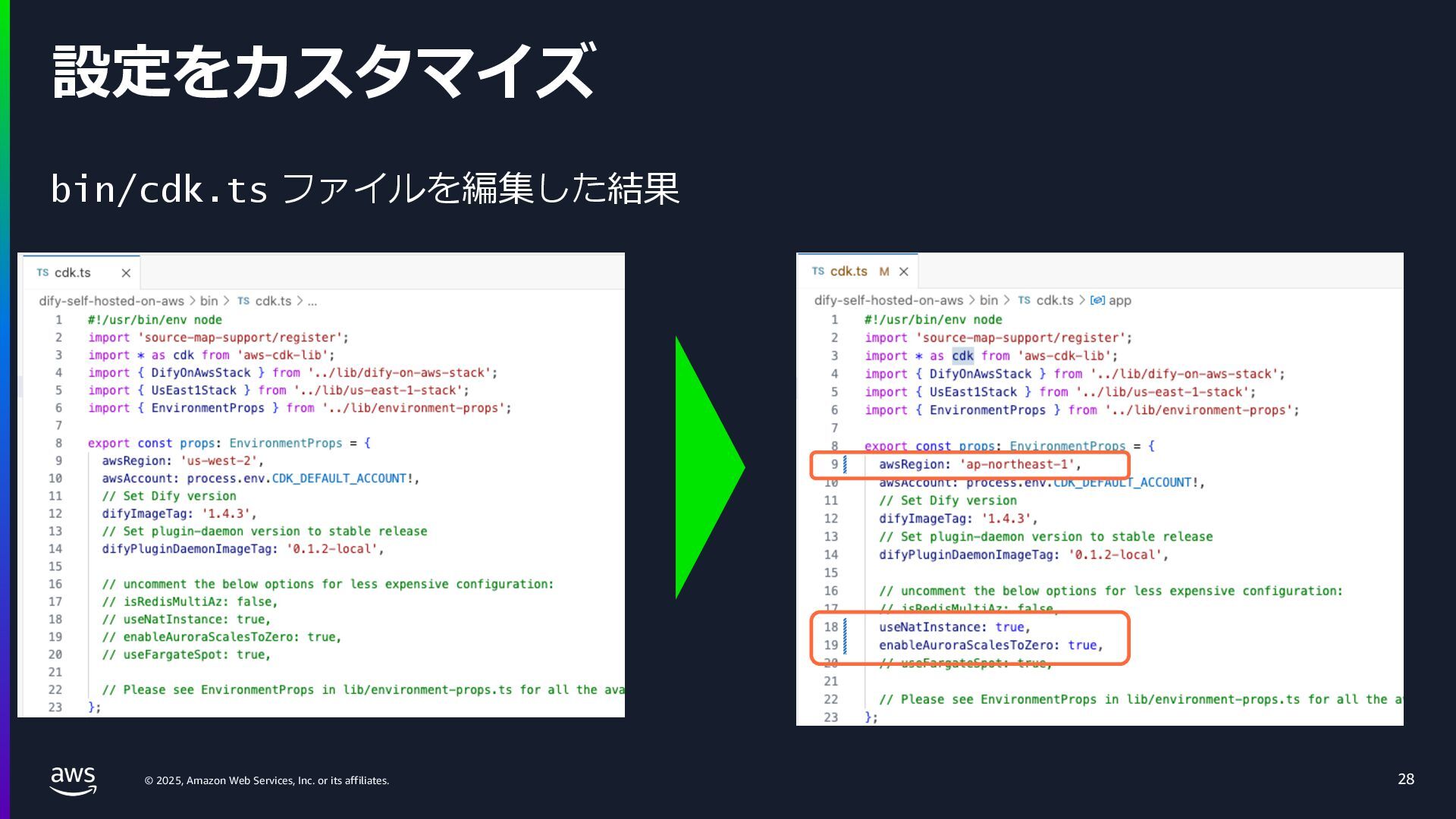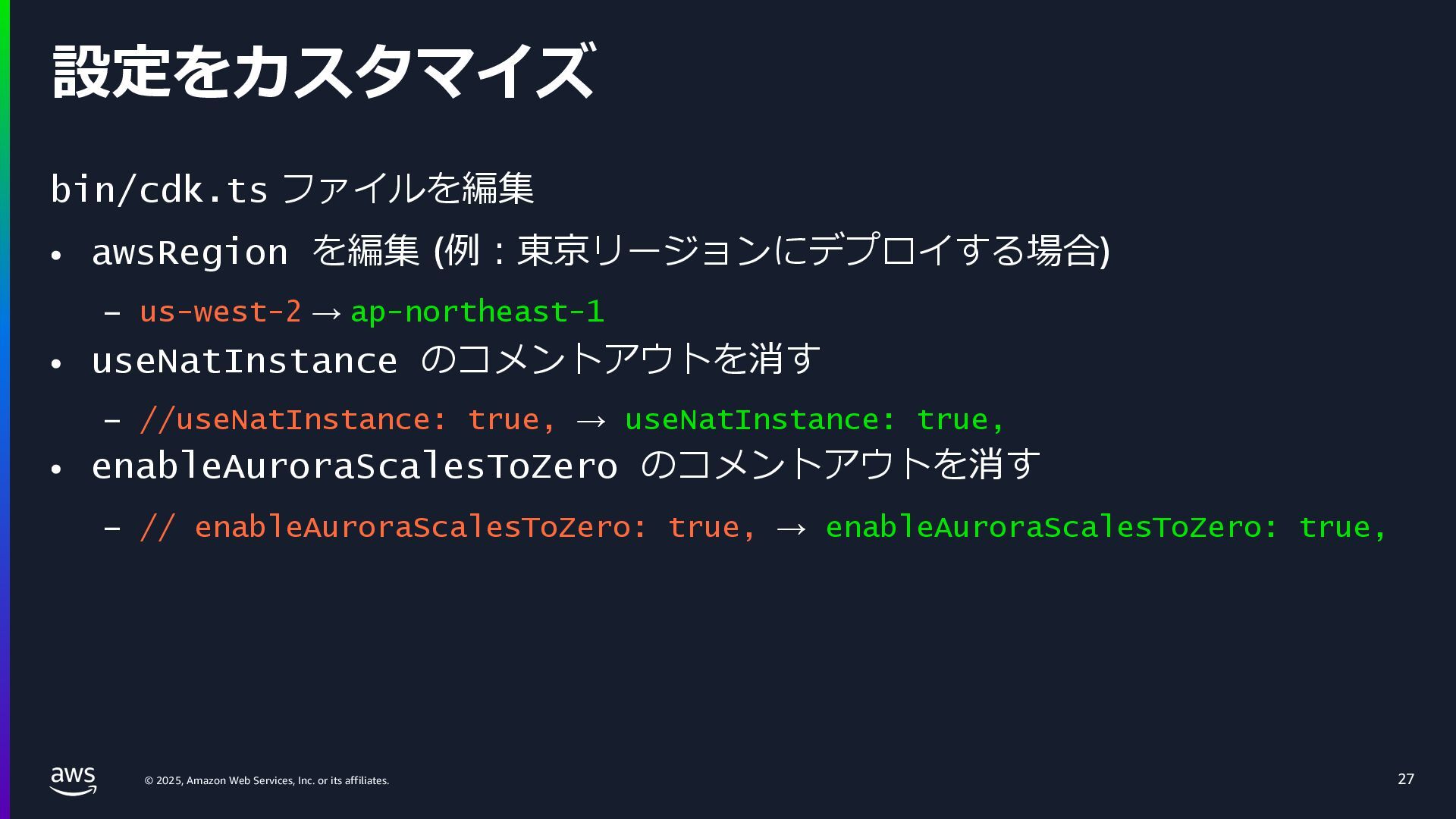 bin/cdk.ts ファイルを編集 • awsRegion を編集 (例︓東京リージョンにデプロイする場合) – us-west-2 → ap-northeast-1 • useNatInstance のコメントアウトを消す – //useNatInstance: true, → useNatInstance: true, • enableAuroraScalesToZero のコメントアウトを消す – // enableAuroraScalesToZero: true, → enableAuroraScalesToZero: true, 27