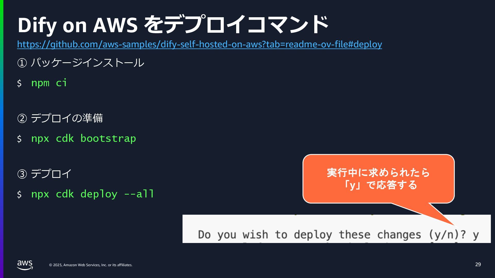 on AWS をデプロイコマンド 29 ① パッケージインストール $ npm ci ② デプロイの準備 $ npx cdk bootstrap ③ デプロイ $ npx cdk deploy --all 実行中に求められたら 「y」で応答する https://github.com/aws-samples/dify-self-hosted-on-aws?tab=readme-ov-file#deploy