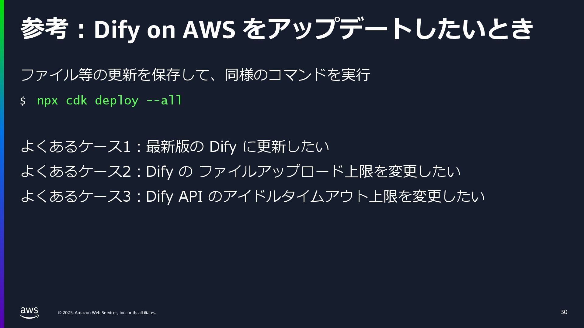 on AWS をアップデートしたいとき 30 ファイル等の更新を保存して、同様のコマンドを実⾏ $ npx cdk deploy --all よくあるケース1︓最新版の Dify に更新したい よくあるケース2︓Dify の ファイルアップロード上限を変更したい よくあるケース3︓Dify API のアイドルタイムアウト上限を変更したい