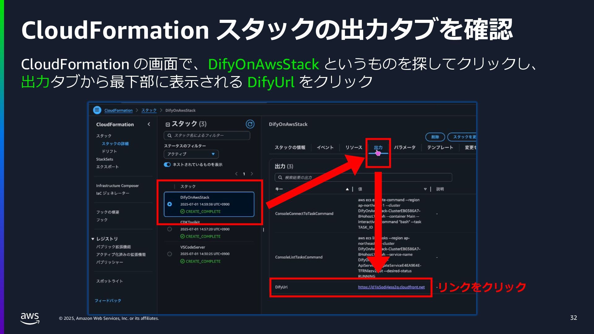 スタックの出⼒タブを確認 CloudFormation の画⾯で、DifyOnAwsStack というものを探してクリックし、 出⼒タブから最下部に表⽰される DifyUrl をクリック 32 リンクをクリック