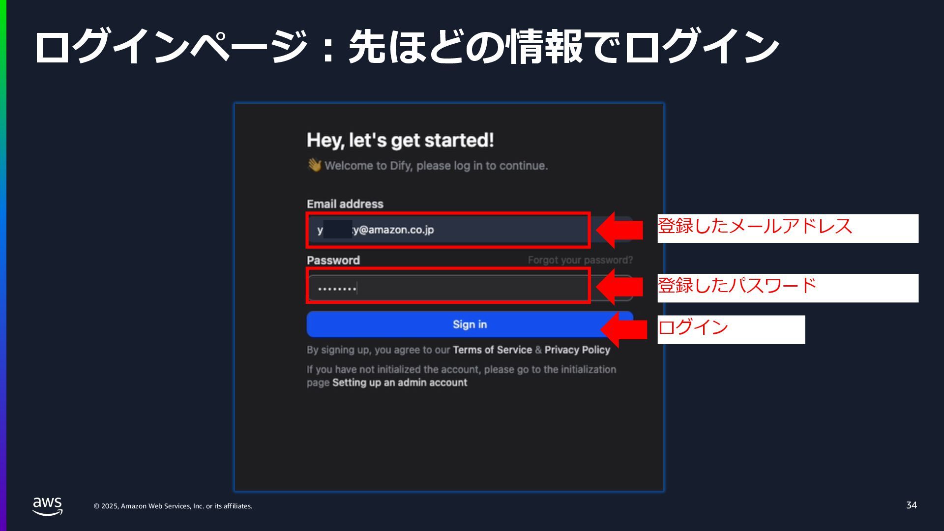 25. © 2025, Amazon Web Services, Inc. or its affiliates. ログインページ︓先ほどの情報でログイン