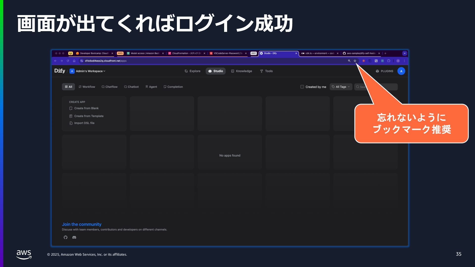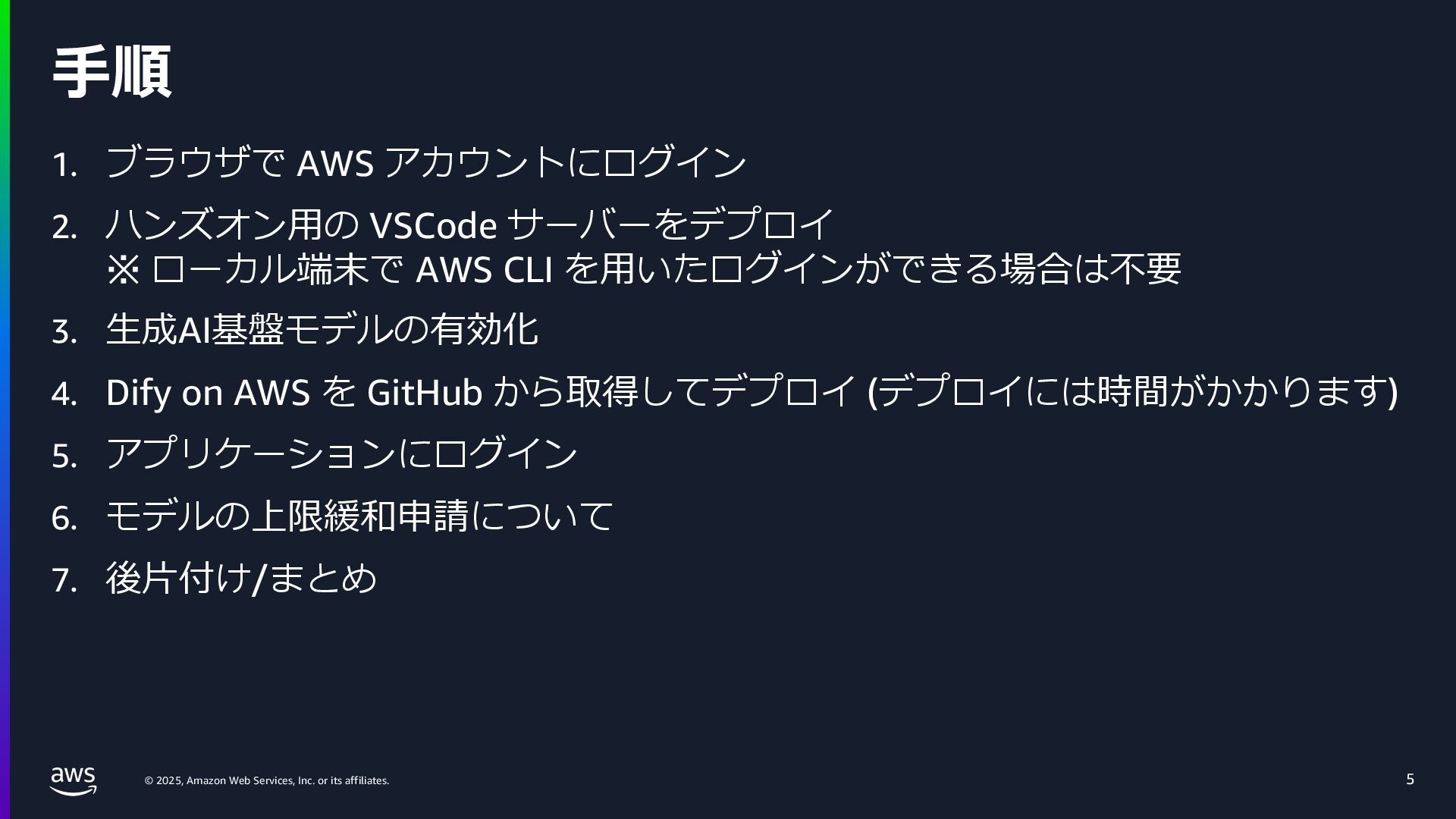 1. ブラウザで AWS アカウントにログイン 2. ハンズオン⽤の VSCode サーバーをデプロイ ※ ローカル端末で AWS CLI を⽤いたログインができる場合は不要 3. ⽣成AI基盤モデルの有効化 4. Dify on AWS を GitHub から取得してデプロイ (デプロイには時間がかかります) 5. アプリケーションにログイン 6. モデルの上限緩和申請について 7. 後⽚付け/まとめ 5