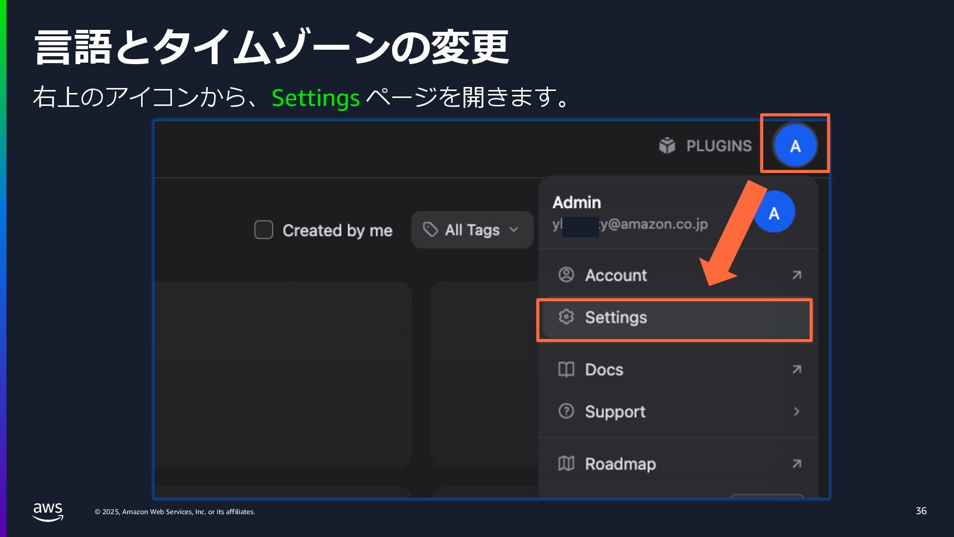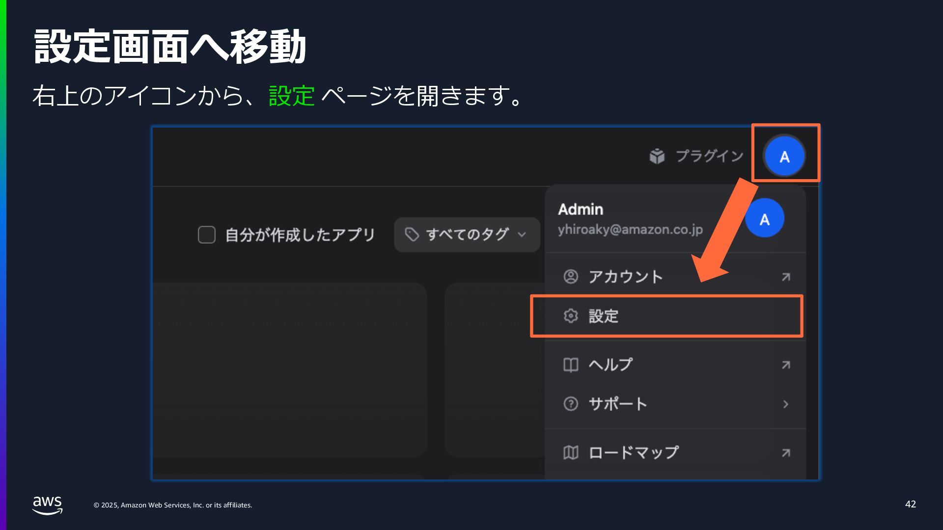 38. © 2025, Amazon Web Services, Inc. or its affiliates. 設定画⾯へ移動