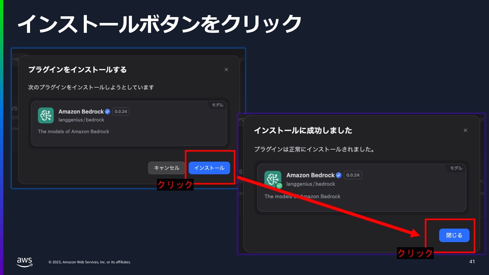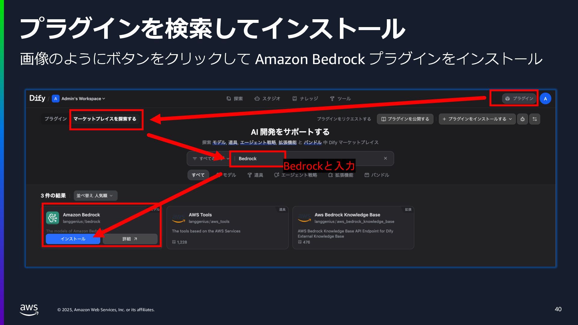 画像のようにボタンをクリックして Amazon Bedrock プラグインをインストール 40 Bedrockと入力