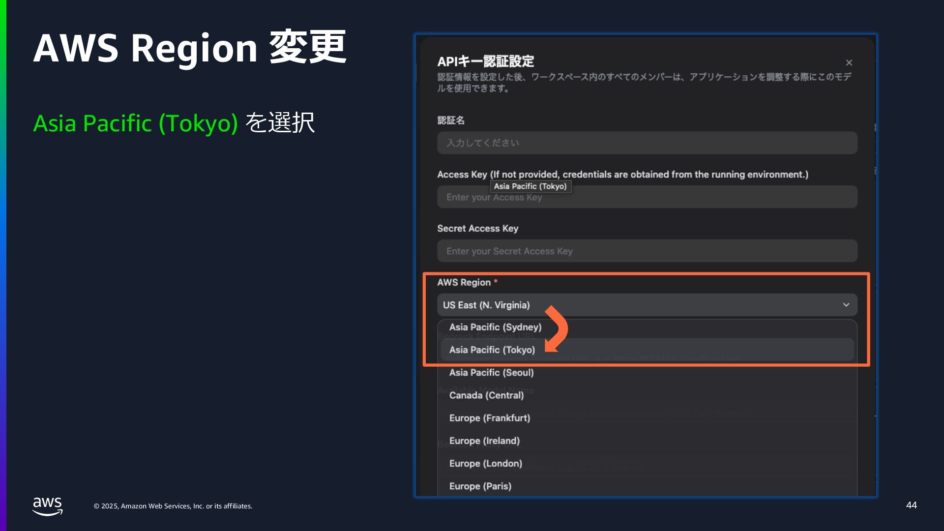 Region 変更 Asia Pacific (Tokyo) を選択 44