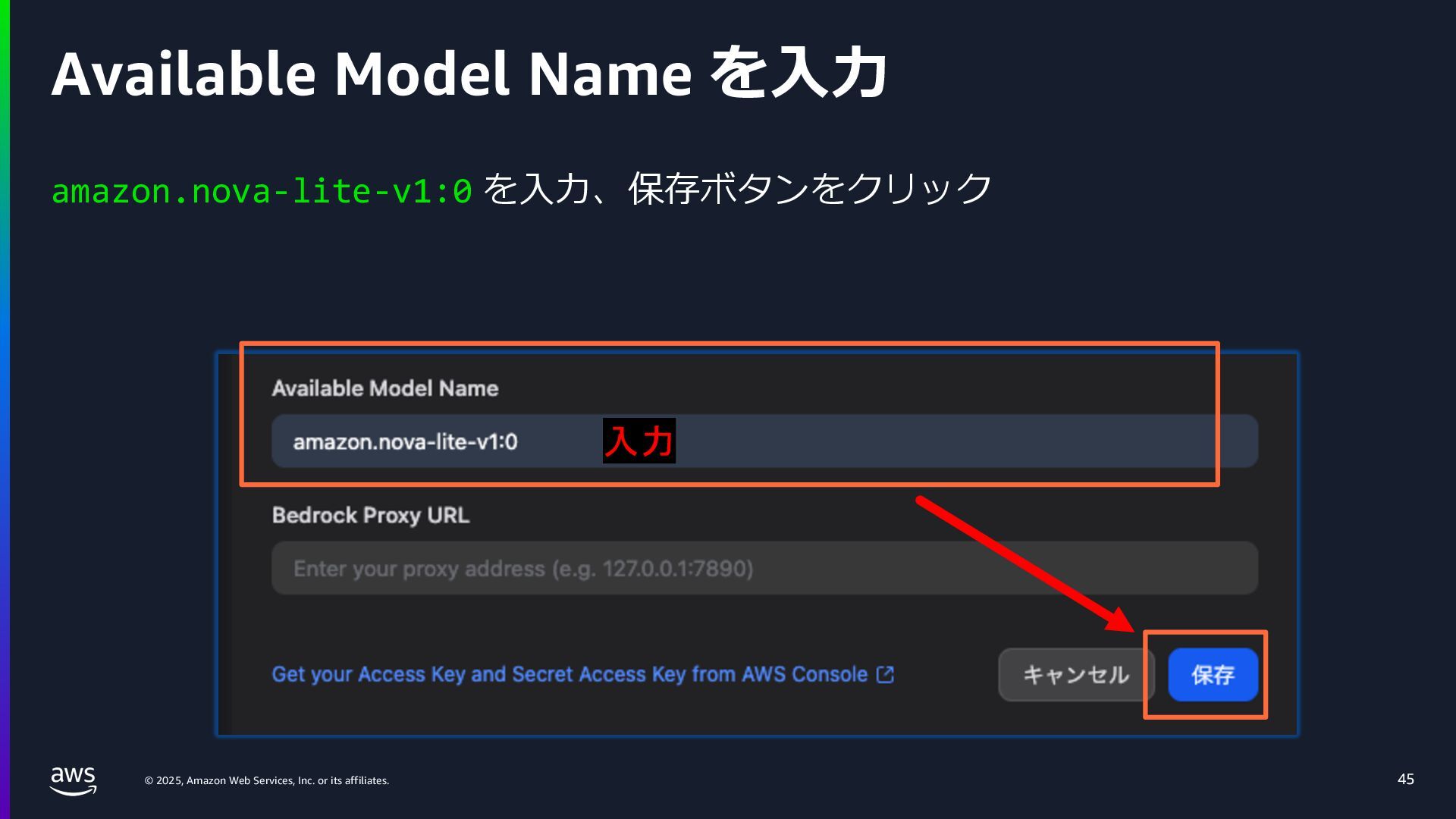 Model Name を⼊⼒ amazon.nova-lite-v1:0 を⼊⼒、保存ボタンをクリック 45 入力