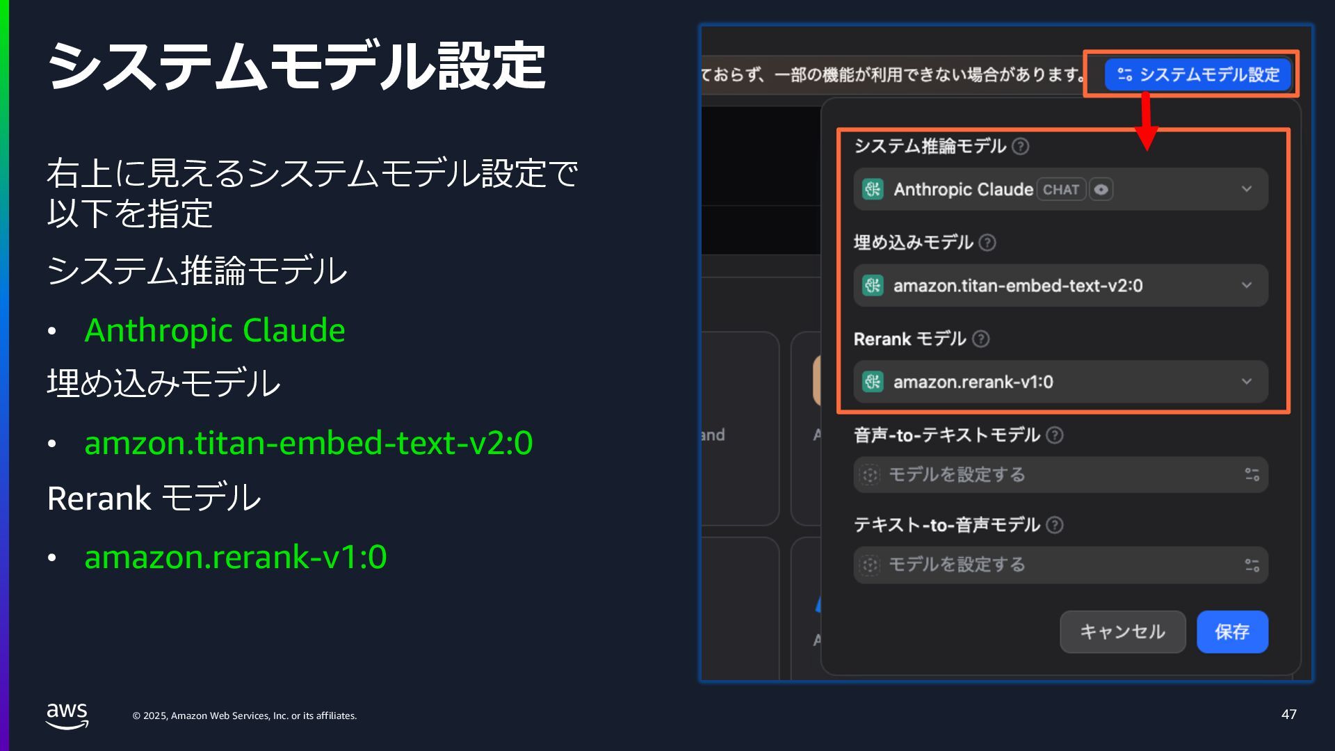 右上に⾒えるシステムモデル設定で 以下を指定 システム推論モデル • Anthropic Claude 埋め込みモデル • amzon.titan-embed-text-v2:0 Rerank モデル • amazon.rerank-v1:0 47