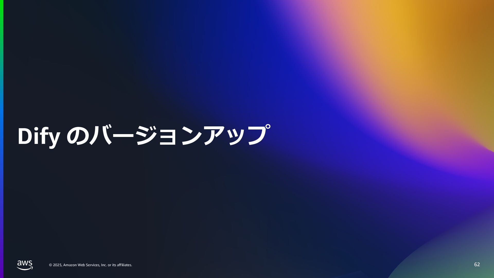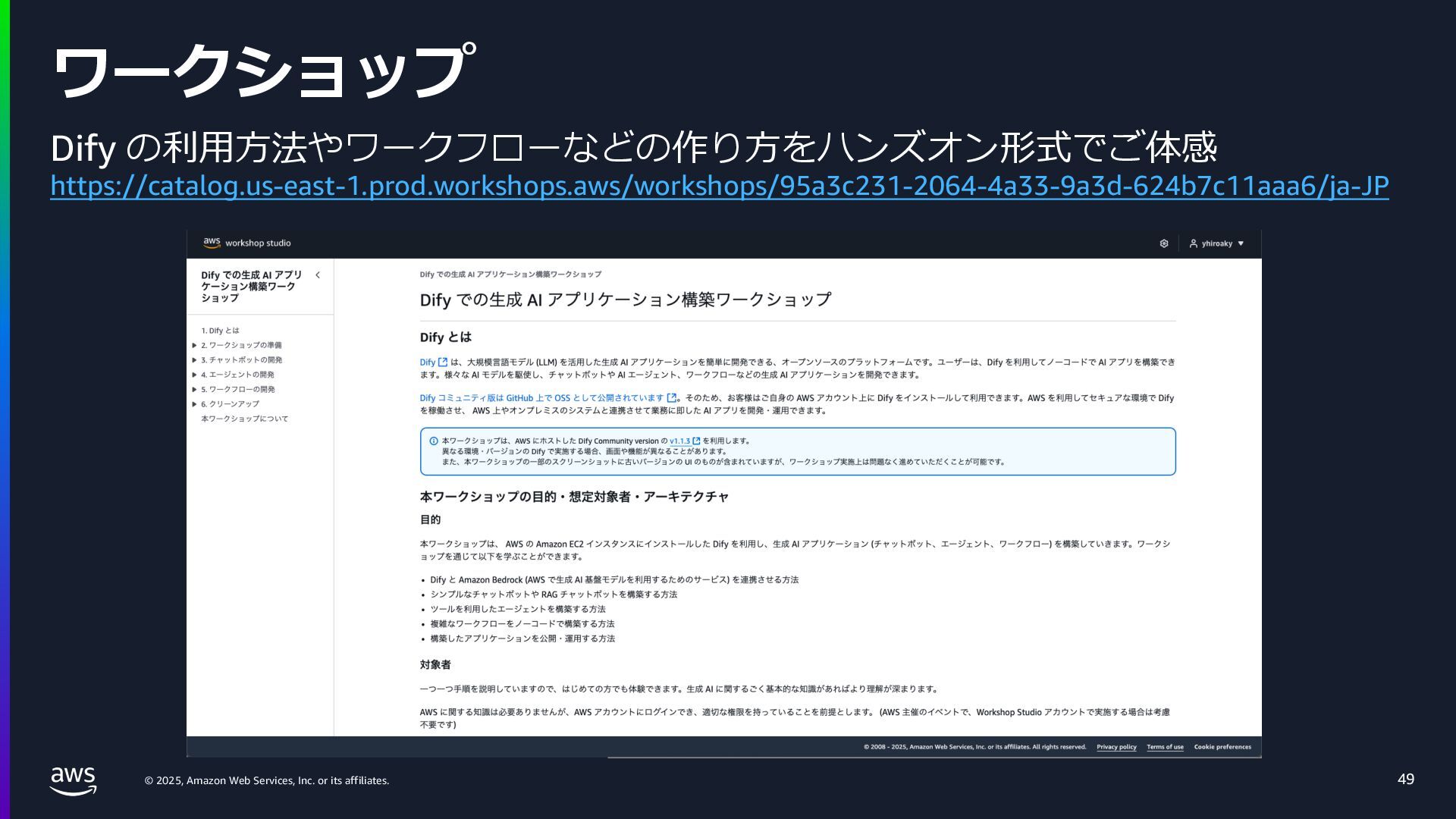 Dify の利⽤⽅法やワークフローなどの作り⽅をハンズオン形式でご体感 https://catalog.us-east-1.prod.workshops.aws/workshops/95a3c231-2064-4a33-9a3d-624b7c11aaa6/ja-JP 49