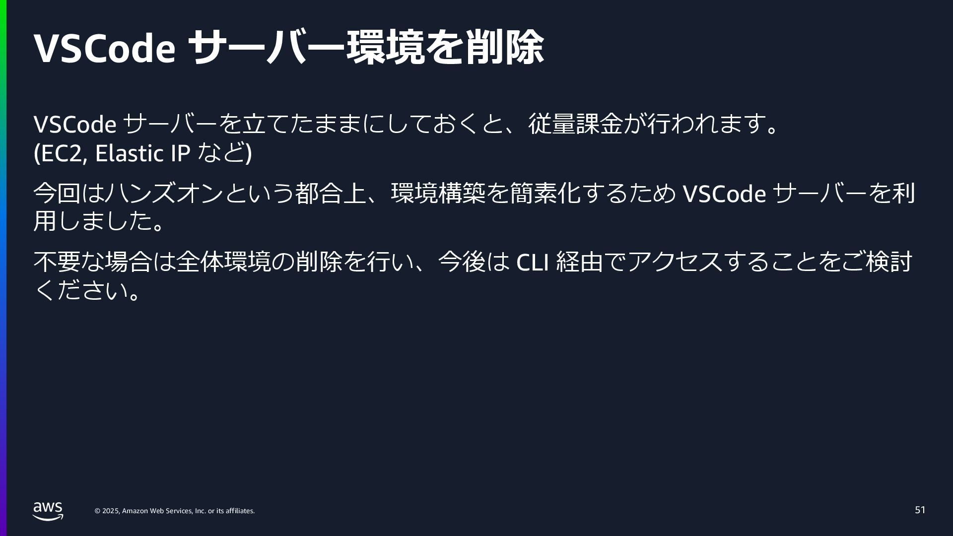 サーバー環境を削除 VSCode サーバーを⽴てたままにしておくと、従量課⾦が⾏われます。 (EC2, Elastic IP など) 今回はハンズオンという都合上、環境構築を簡素化するため VSCode サーバーを利 ⽤しました。 不要な場合は全体環境の削除を⾏い、今後は CLI 経由でアクセスすることをご検討 ください。 51