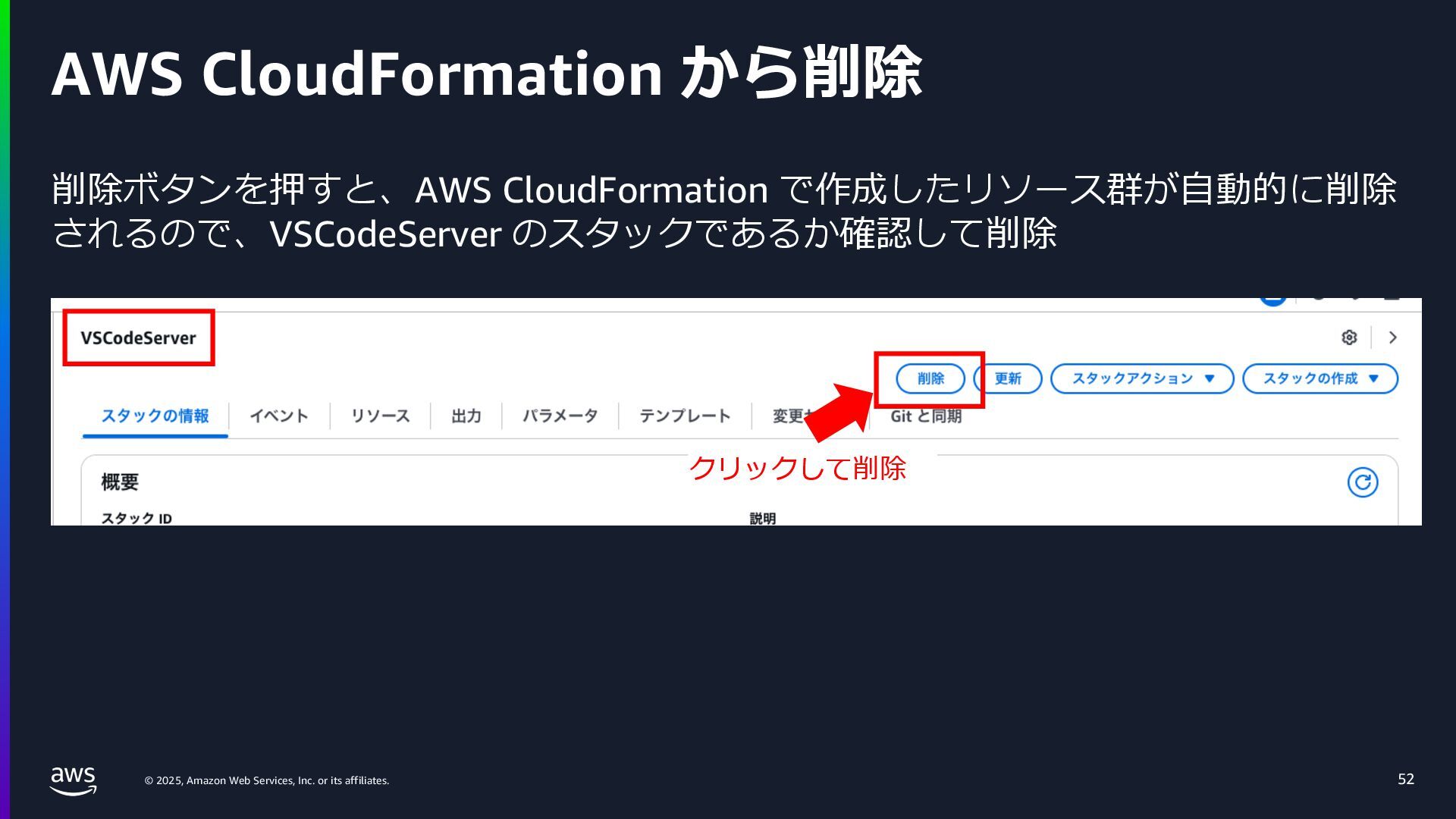 CloudFormation から削除 削除ボタンを押すと、AWS CloudFormation で作成したリソース群が⾃動的に削除 されるので、VSCodeServer のスタックであるか確認して削除 52 クリックして削除