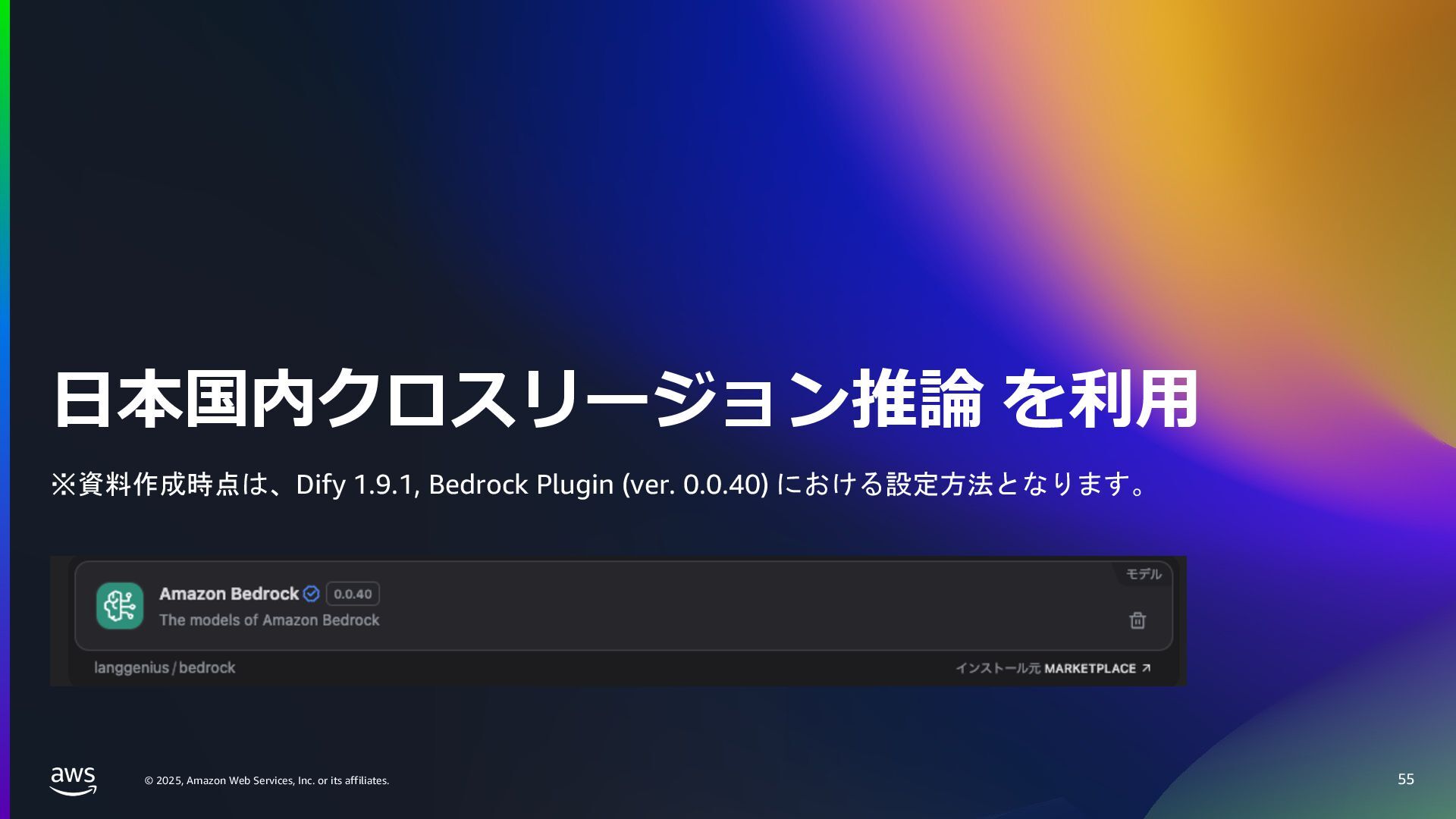 を利⽤ 55 ※資料作成時点は、Dify 1.9.1, Bedrock Plugin (ver. 0.0.40) における設定方法となります。