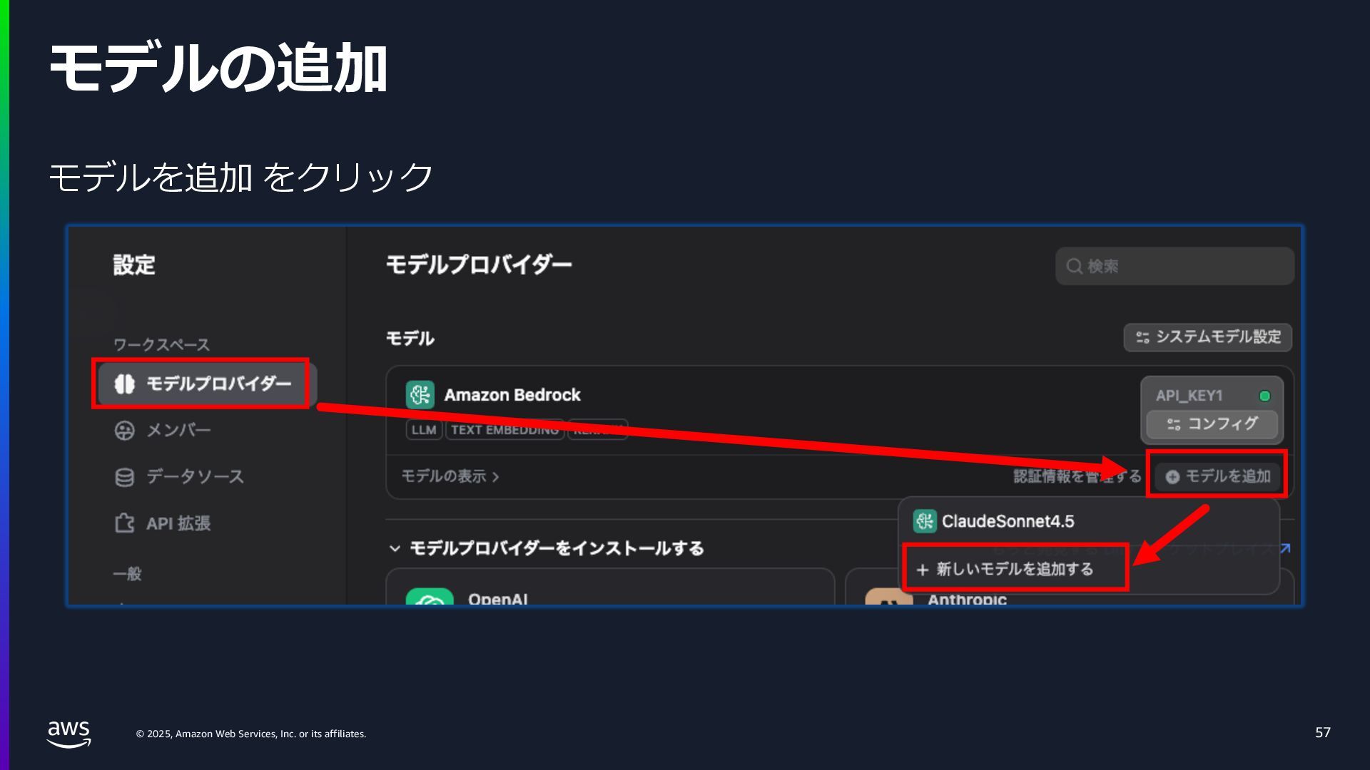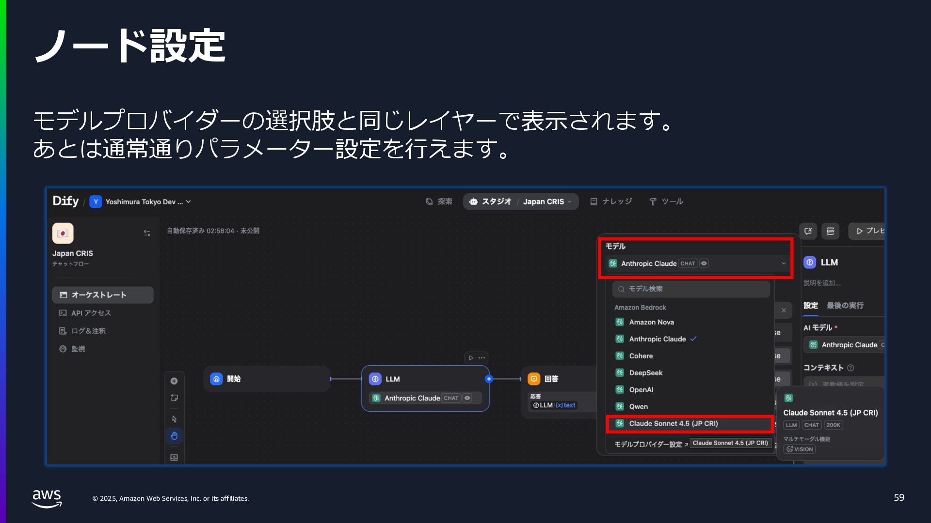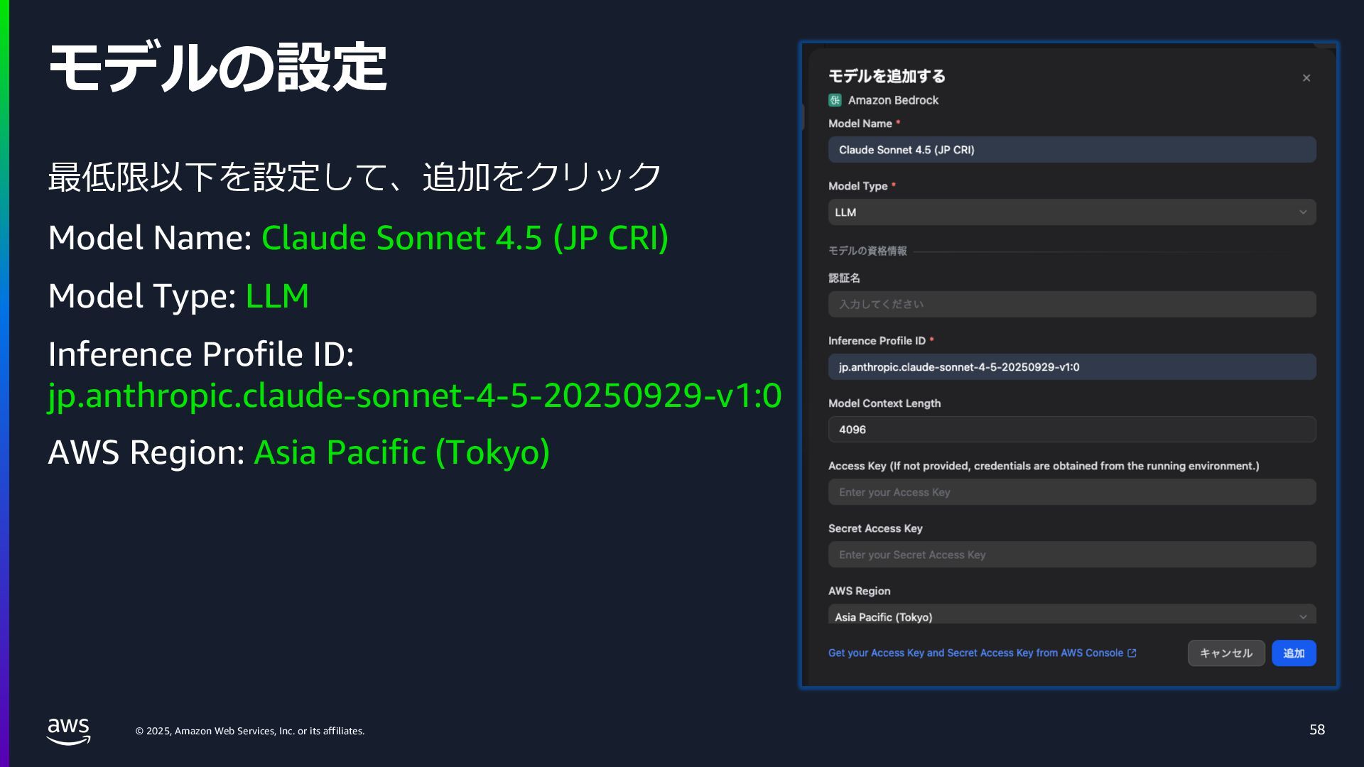 最低限以下を設定して、追加をクリック Model Name: Claude Sonnet 4.5 (JP CRI) Model Type: LLM Inference Profile ID: jp.anthropic.claude-sonnet-4-5-20250929-v1:0 AWS Region: Asia Pacific (Tokyo) 58