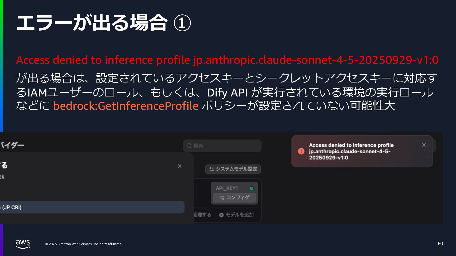 ① Access denied to inference profile jp.anthropic.claude-sonnet-4-5-20250929-v1:0 が出る場合は、設定されているアクセスキーとシークレットアクセスキーに対応す るIAMユーザーのロール、もしくは、Dify API が実⾏されている環境の実⾏ロール などに bedrock:GetInferenceProfile ポリシーが設定されていない可能性⼤ 60