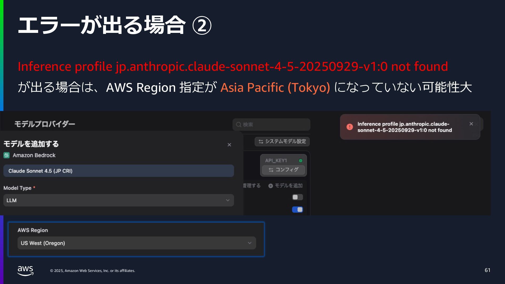 ② Inference profile jp.anthropic.claude-sonnet-4-5-20250929-v1:0 not found が出る場合は、AWS Region 指定が Asia Pacific (Tokyo) になっていない可能性⼤ 61