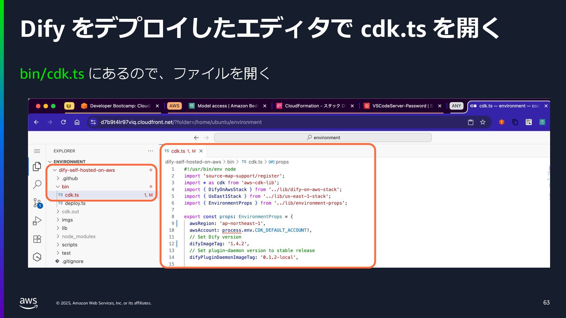 をデプロイしたエディタで cdk.ts を開く bin/cdk.ts にあるので、ファイルを開く 63