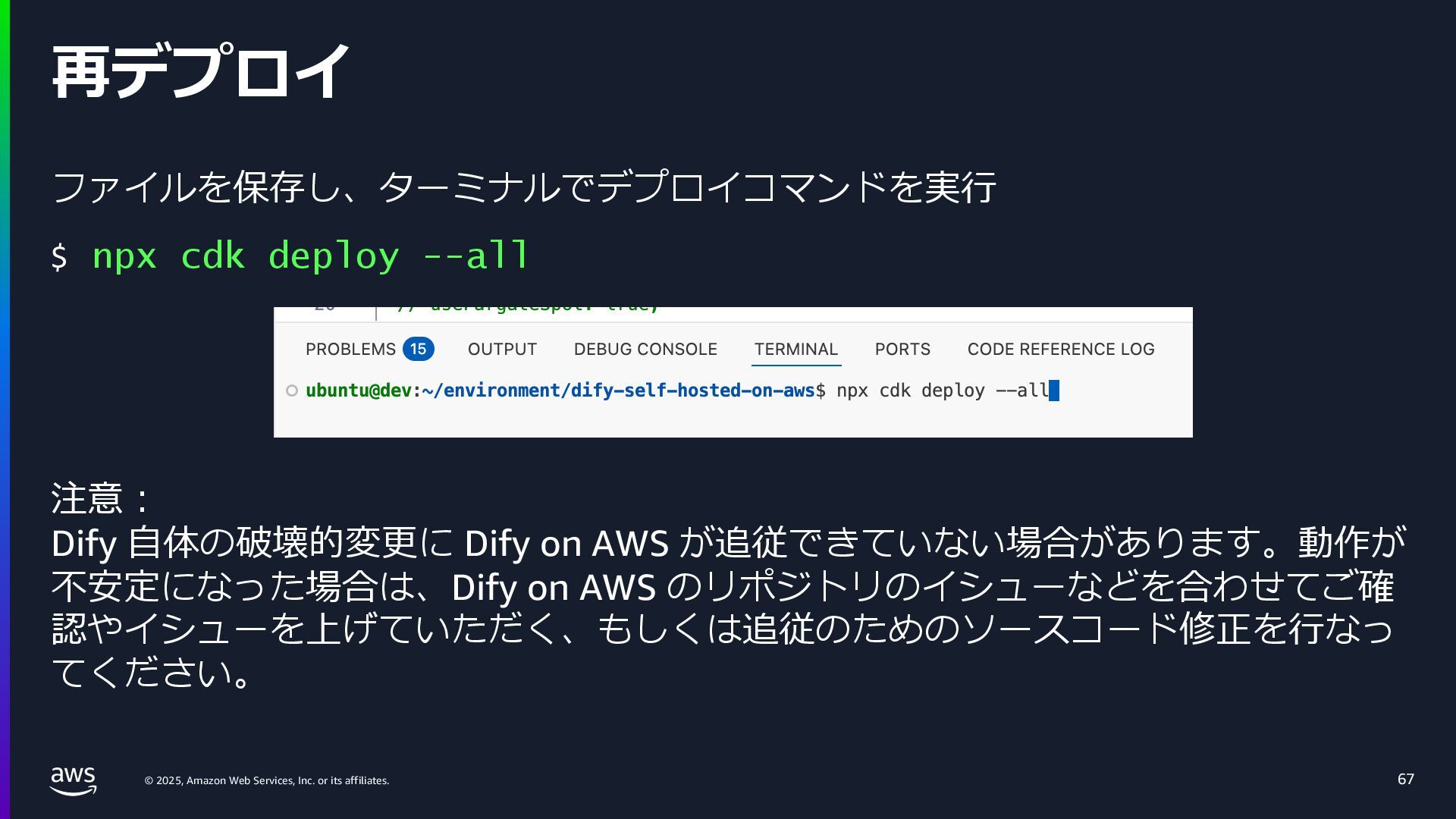 ファイルを保存し、ターミナルでデプロイコマンドを実⾏ $ npx cdk deploy --all 注意︓ Dify ⾃体の破壊的変更に Dify on AWS が追従できていない場合があります。動作が 不安定になった場合は、Dify on AWS のリポジトリのイシューなどを合わせてご確 認やイシューを上げていただく、もしくは追従のためのソースコード修正を⾏なっ てください。 67
