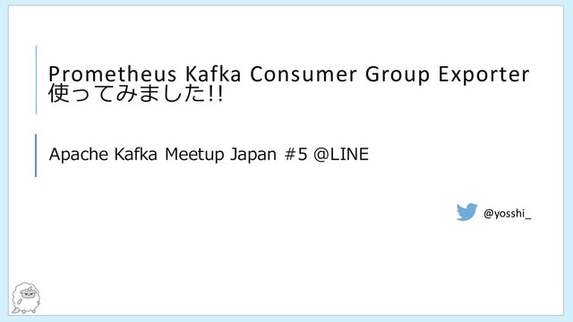1 kafka_consumer_group_offset{group, topic, partition} 2 kafka_consumer_group_lag{group, topic, partition} 3 kafka_consumer_group_lead{group, topic, partition} 4 kafka_consumer_group_commits{group, topic, partition} 5 kafka_consumer_group_exporter_offset{partition} 6 kafka_consumer_group_exporter_lag{partition} 7 kafka_consumer_group_exporter_lead{partition} 8 kafka_topic_highwater{topic, partition} 9 kafka_topic_lowwater{topic, partition} n 取れるMetrics