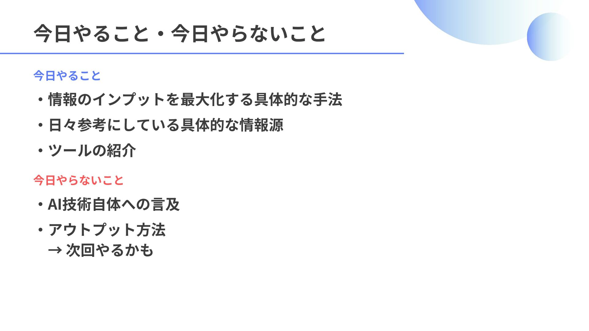 ・情報のインプットを最大化する具体的な手法 今日やること・今日やらないこと 今日やること 今日やらないこと ・AI技術自体への言及 ・アウトプット方法 → 次回やるかも ・日々参考にしている具体的な情報源 ・ツールの紹介