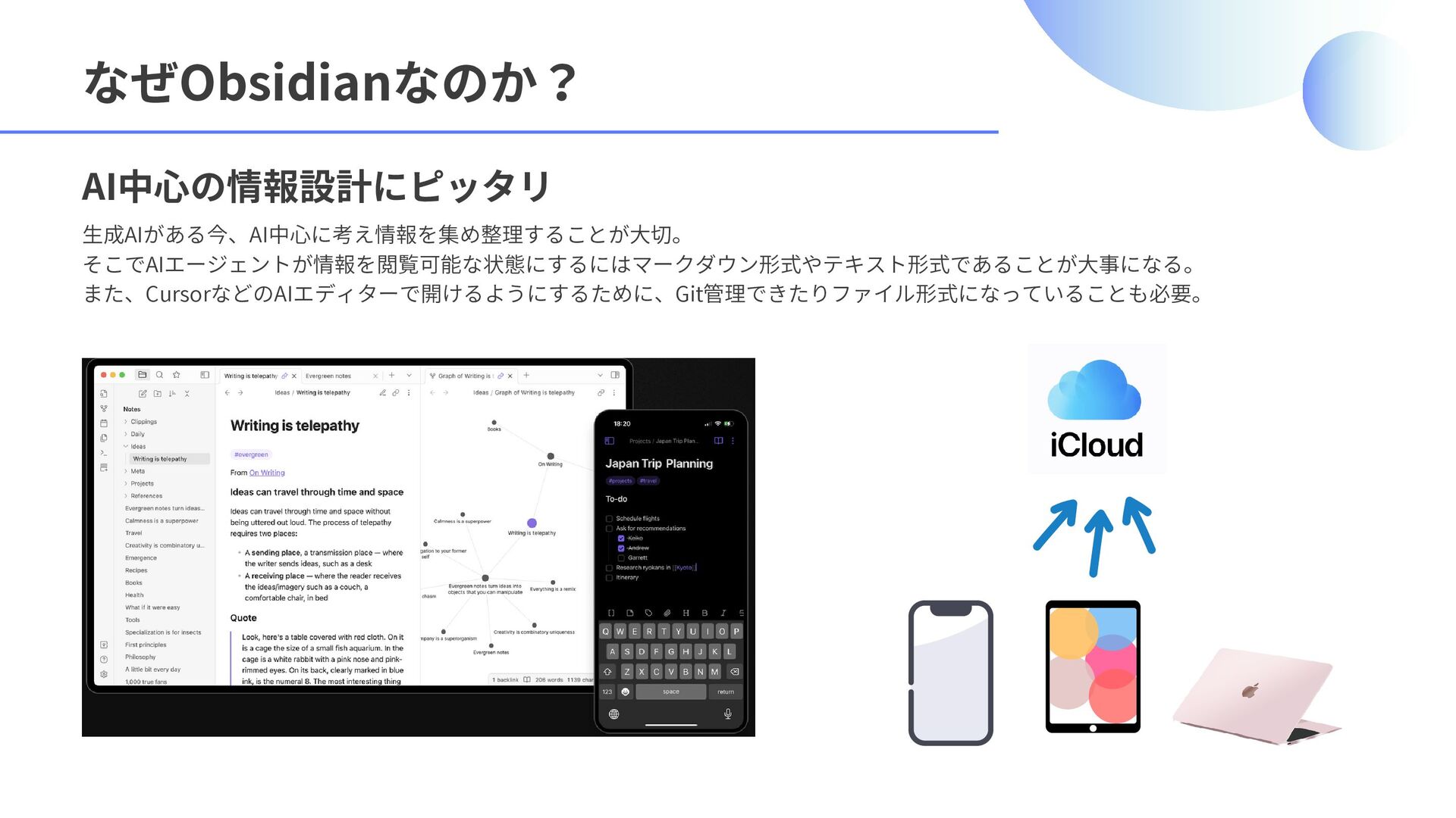なぜObsidianなのか? AI中心の情報設計にピッタリ 生成AIがある今、AI中心に考え情報を集め整理することが大切。 そこでAIエージェントが情報を閲覧可能な状態にするにはマークダウン形式やテキスト形式であることが大事になる。 また、CursorなどのAIエディターで開けるようにするために、Git管理できたりファイル形式になっていることも必要。