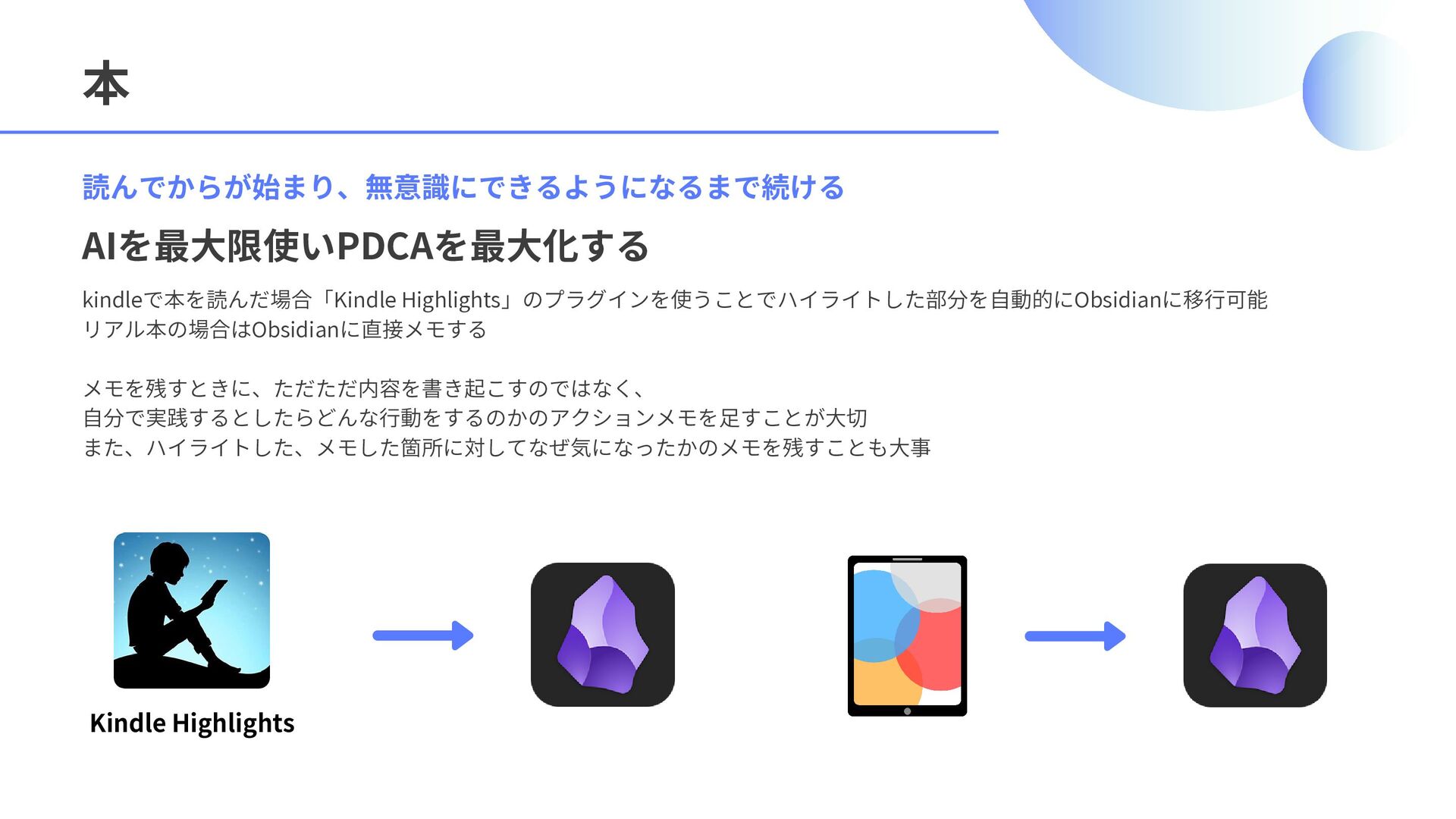 Kindle Highlights 本 kindleで本を読んだ場合「Kindle Highlights」のプラグインを使うことでハイライトした部分を自動的にObsidianに移行可能 リアル本の場合はObsidianに直接メモする メモを残すときに、ただただ内容を書き起こすのではなく、 自分で実践するとしたらどんな行動をするのかのアクションメモを足すことが大切 また、ハイライトした、メモした箇所に対してなぜ気になったかのメモを残すことも大事 AIを最大限使いPDCAを最大化する