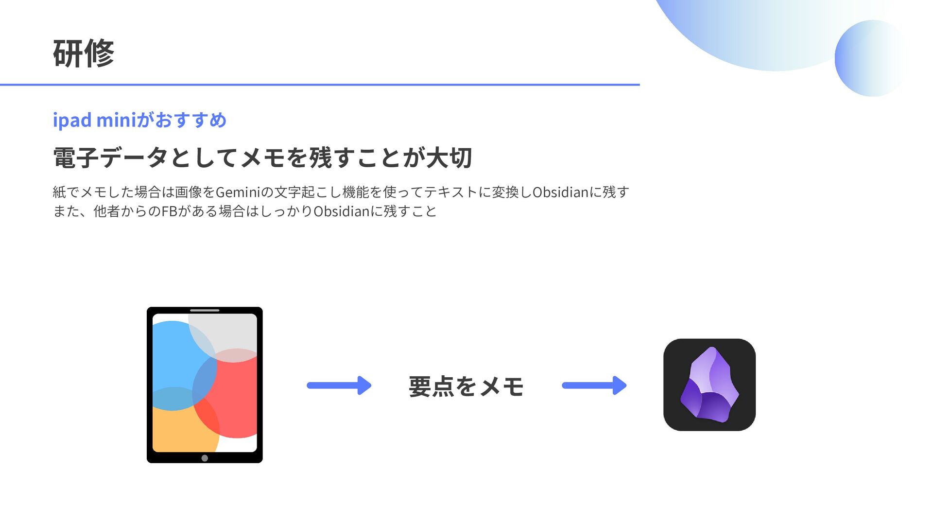 研修 紙でメモした場合は画像をGeminiの文字起こし機能を使ってテキストに変換しObsidianに残す また、他者からのFBがある場合はしっかりObsidianに残すこと 電子データとしてメモを残すことが大切 ipad miniがおすすめ 要点をメモ