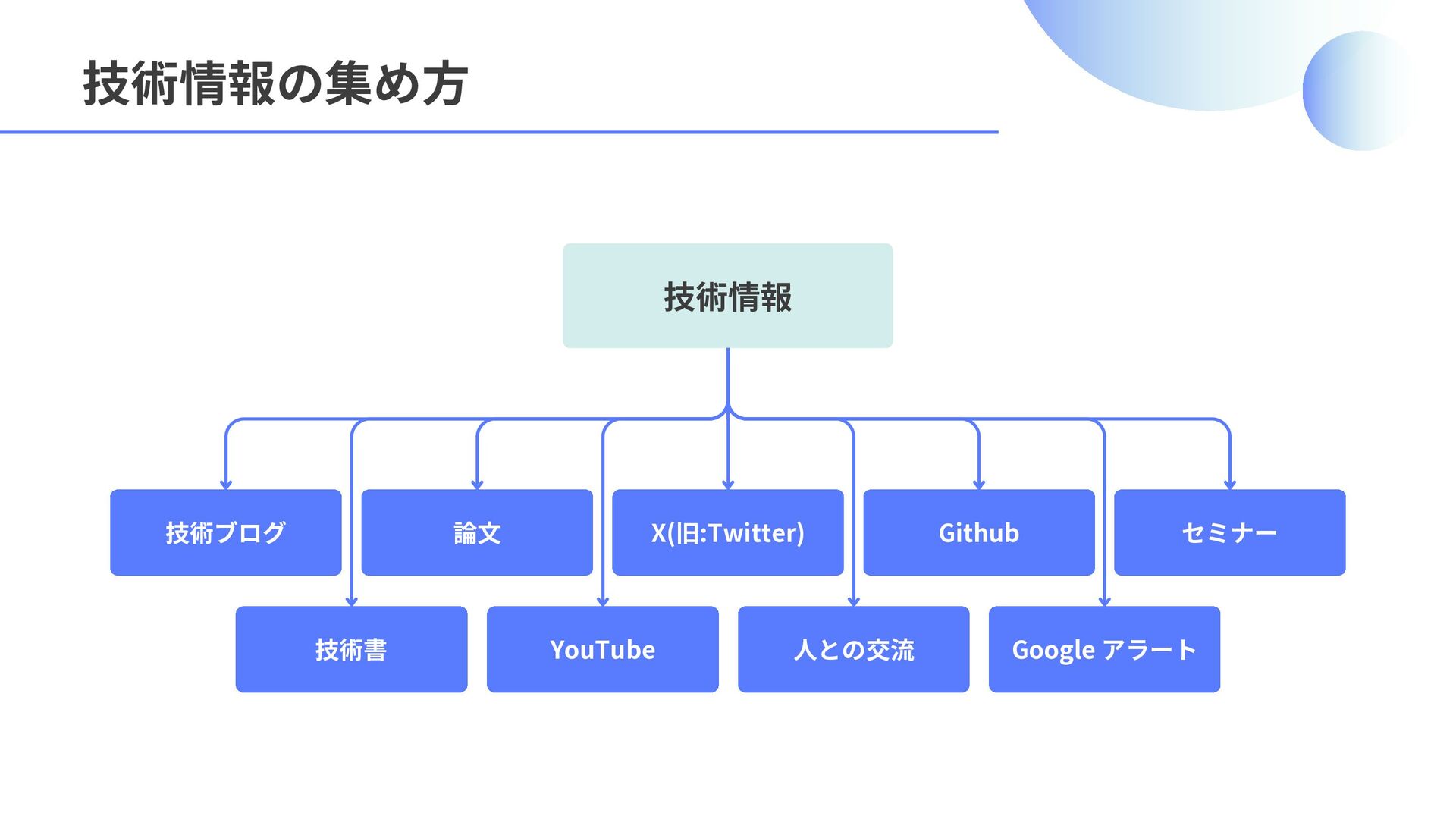 技術情報の集め方 技術情報 技術ブログ 論文 セミナー X(旧:Twitter) Github 技術書 YouTube 人との交流
