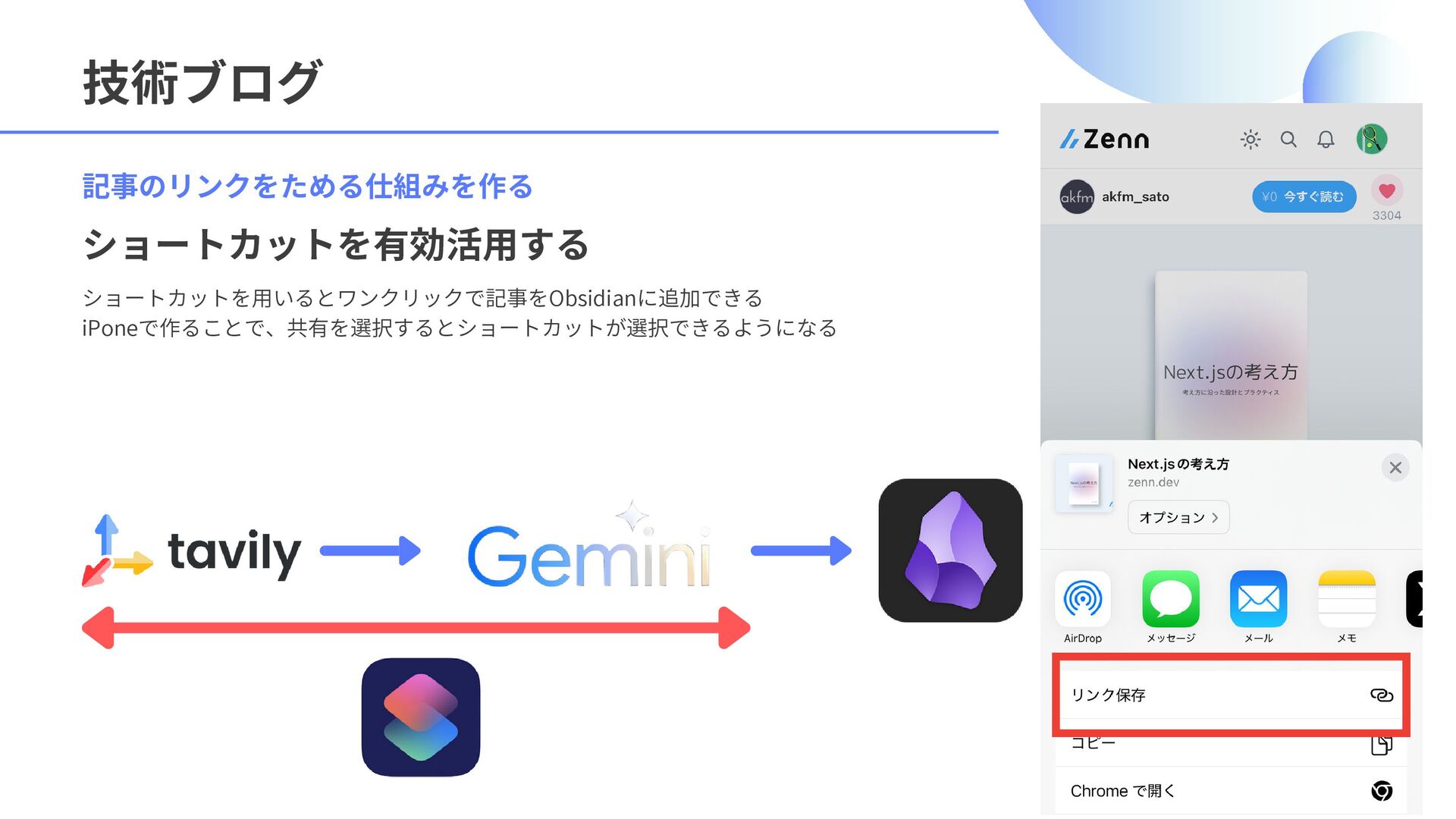 技術ブログ ショートカットを用いるとワンクリックで記事をObsidianに追加できる iPoneで作ることで、共有を選択するとショートカットが選択できるようになる ショートカットを有効活用する 記事のリンクをためる仕組みを作る