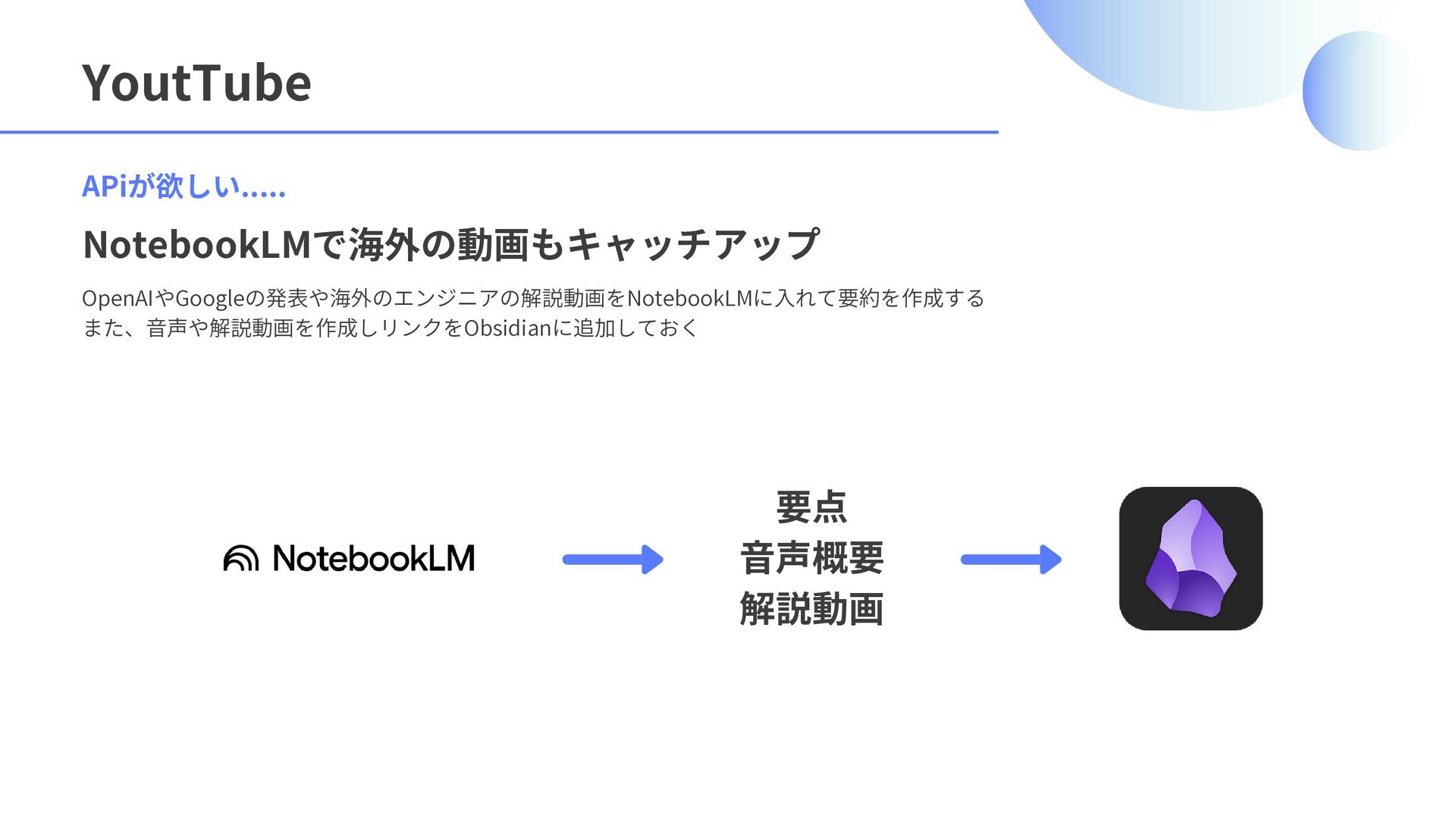 YoutTube OpenAIやGoogleの発表や海外のエンジニアの解説動画をNotebookLMに入れて要約を作成する また、音声や解説動画を作成しリンクをObsidianに追加しておく NotebookLMで海外の動画もキャッチアップ APiが欲しい..... 要点 音声概要 解説動画