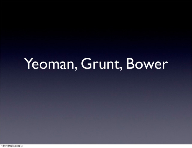 Grunt݁ߏͬͯΔϓϩμΫτଟ Bower݁ߏͬͯΔϓϩμΫτগ Yeoman݁ߏͬͯΔϓϩμΫτແ ଟYeomanͷ࡞Γํ͕ਁಁ͖ͬͯ͠ͳ͍;_; 1310݄26༵