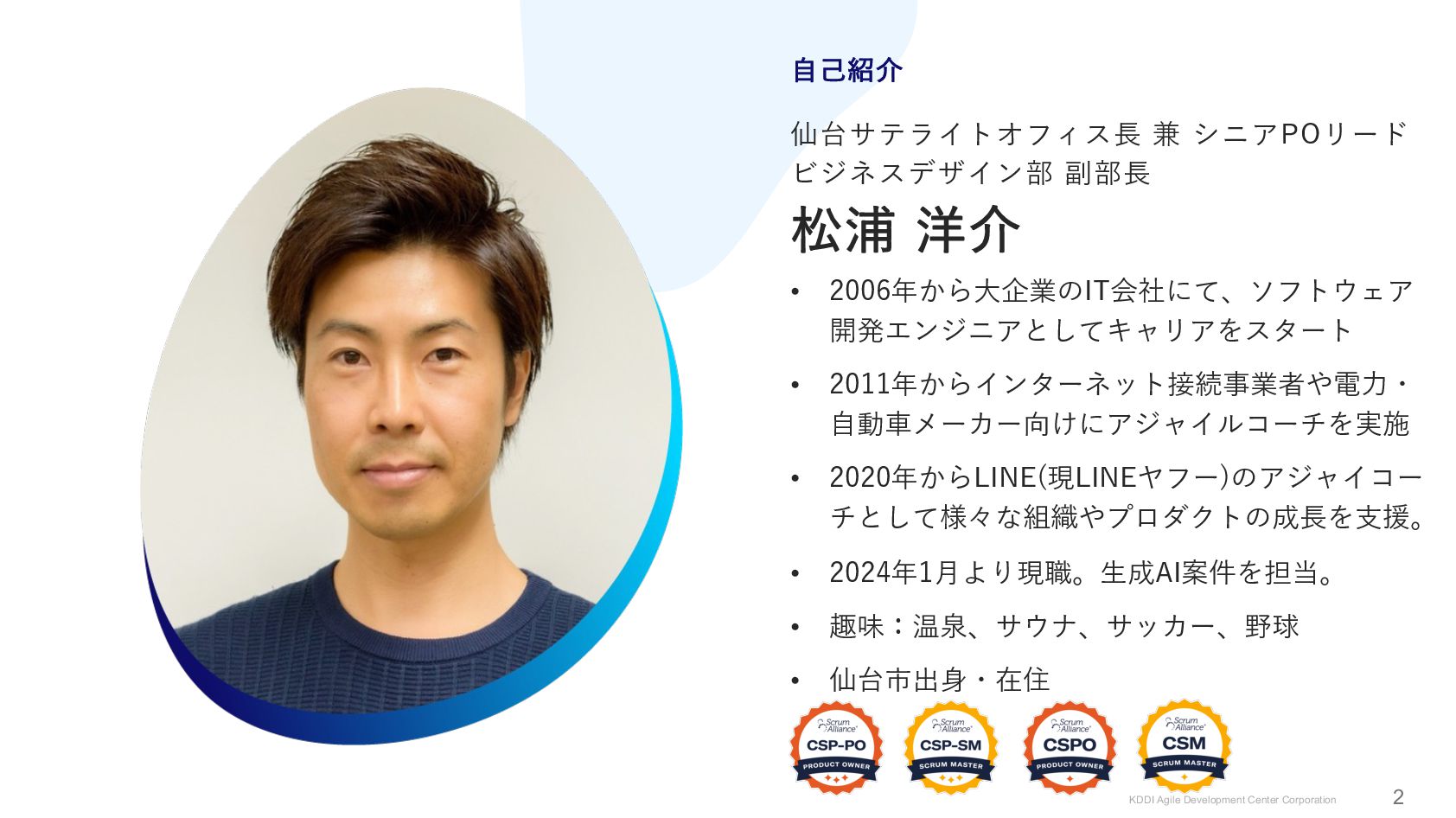 • 2011年からインターネット接続事業者や電⼒・ ⾃動⾞メーカー向けにアジャイルコーチを実施 • 2020年からLINE(現LINEヤフー)のアジャイコー チとして様々な組織やプロダクトの成⻑を⽀援。 • 2024年1⽉より現職。⽣成AI案件を担当。 • 趣味:温泉、サウナ、サッカー、野球 • 仙台市出⾝・在住 ⾃⼰紹介 KDDI Agile Development Center Corporation 2
