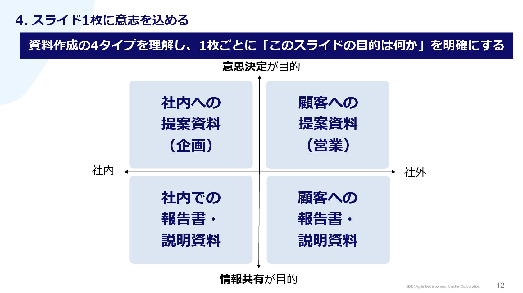4. スライド1枚に意志を込める KDDI Agile Development Center Corporation 12 意思決定が⽬的 情報共有が⽬的
