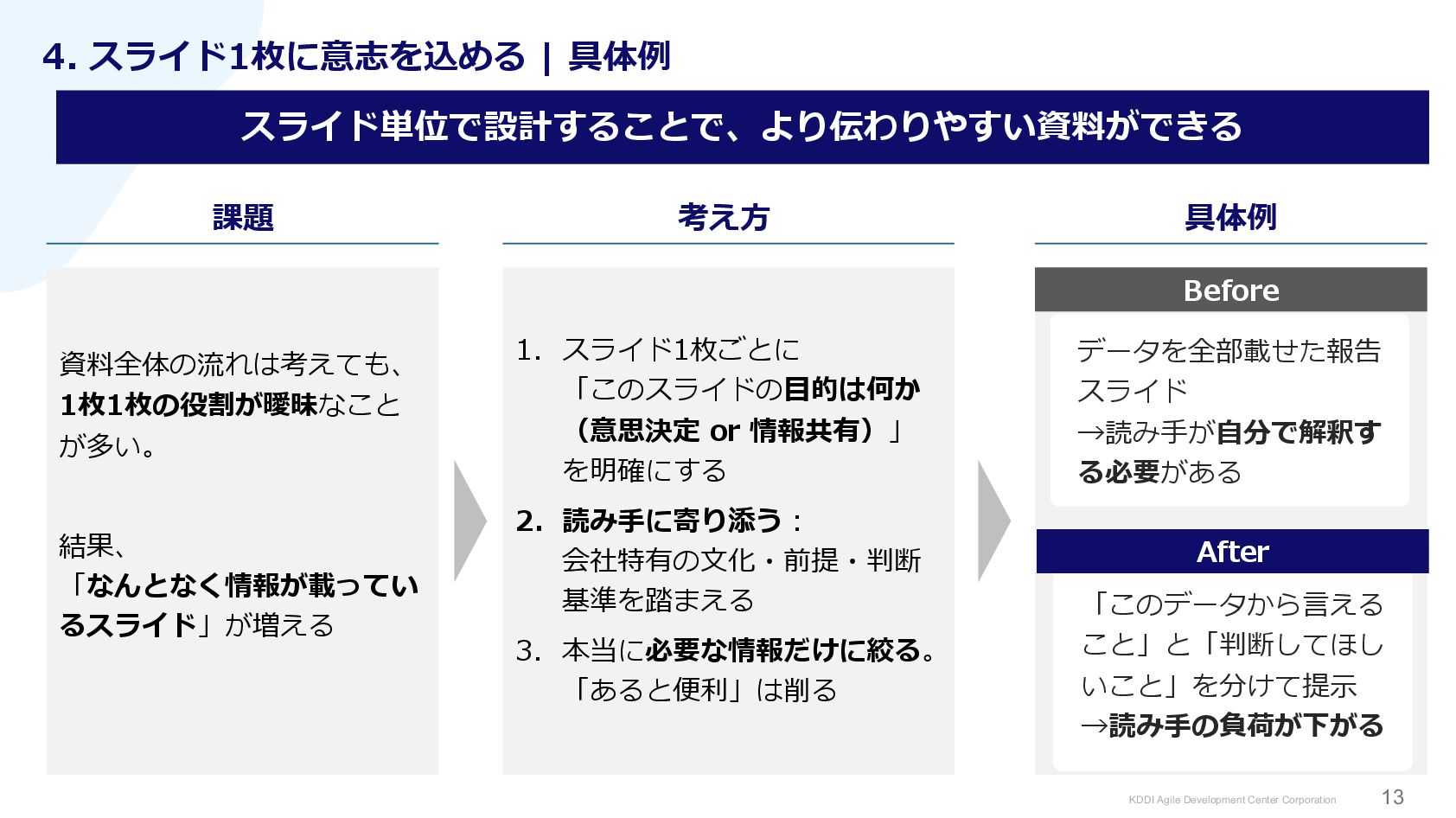 4. スライド1枚に意志を込める | 具体例 KDDI Agile Development Center Corporation 13