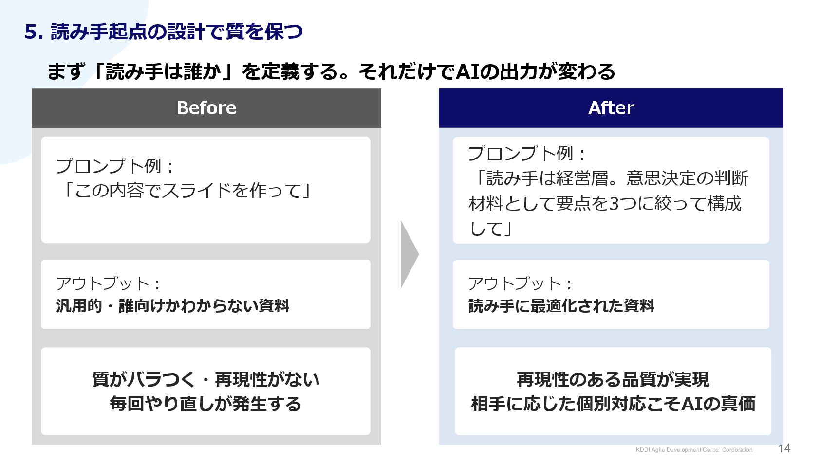 5. 読み⼿起点の設計で質を保つ KDDI Agile Development Center Corporation 14 Before プロンプト例︓